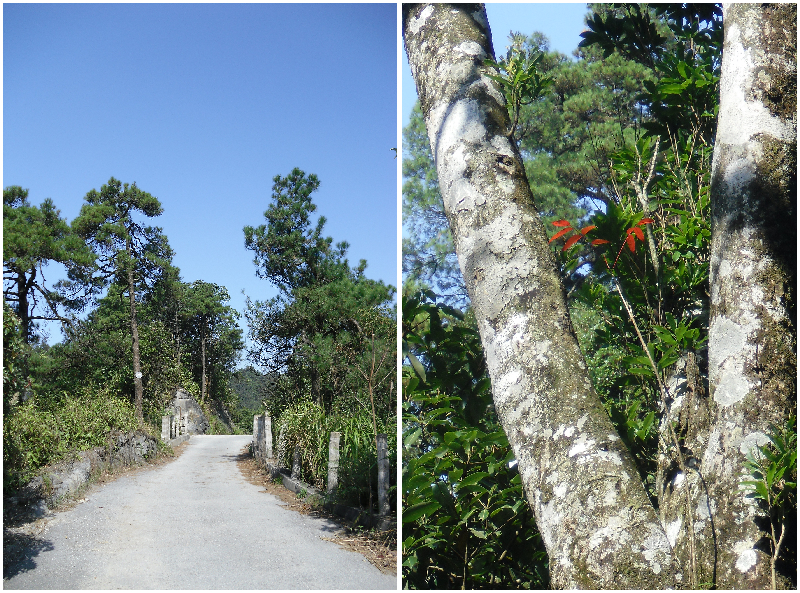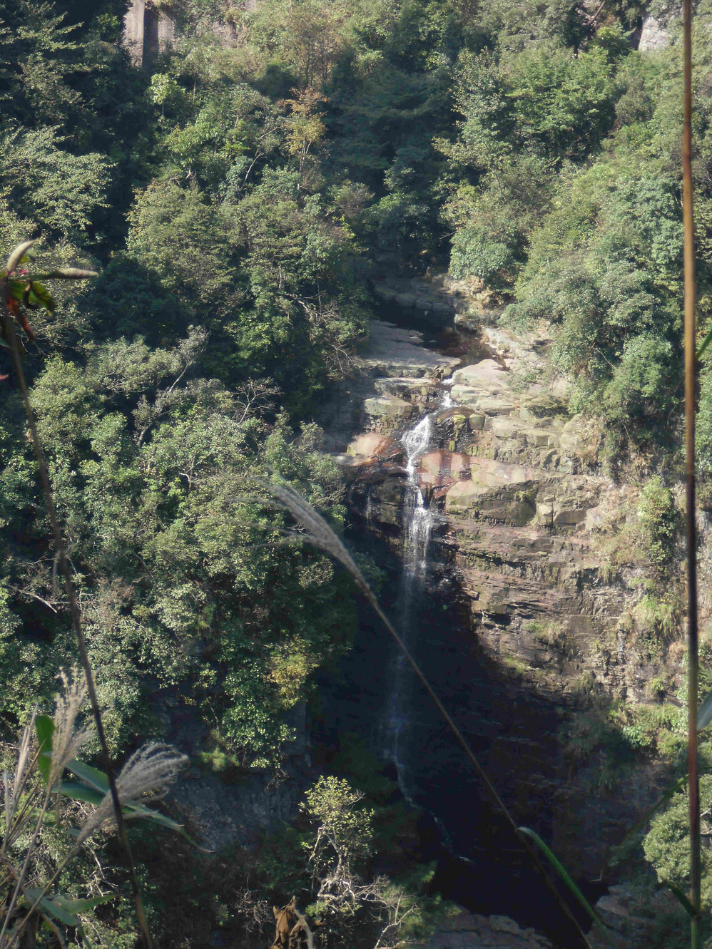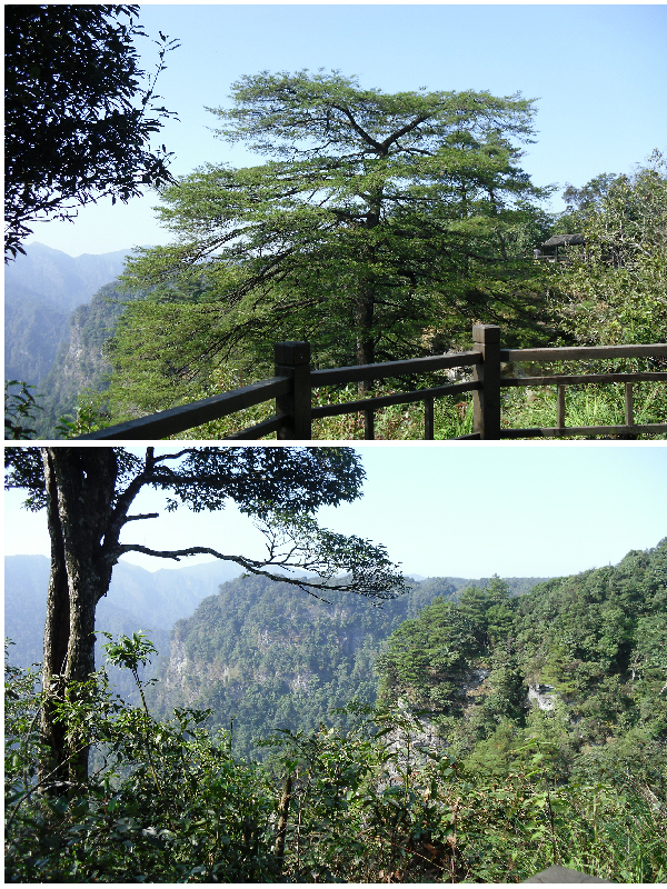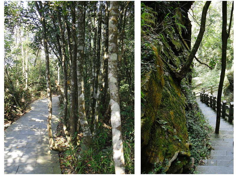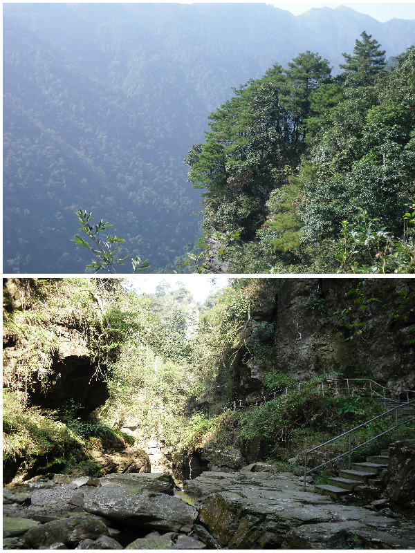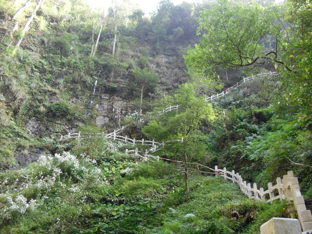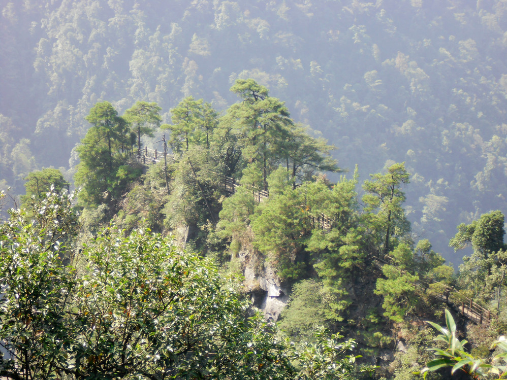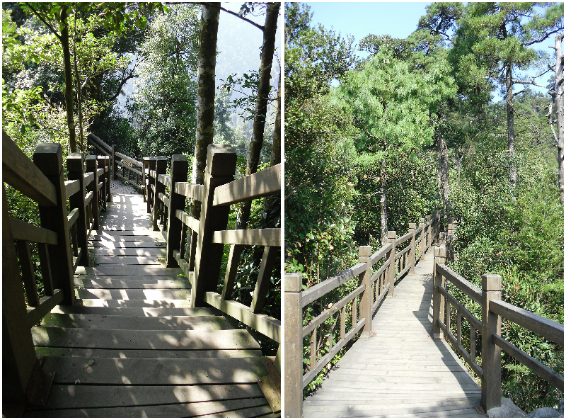 饭饱后到处闲逛,走走休闲之旅,感受一下天然氧吧吧。这条路一路先是往山谷走,然后再向上爬,全程大概1个半小时。往往我们都是先爬山,如果累了就不爬了。这就有一个错觉,下山谷的时候觉得体力还行,可是真正的到了谷底后向上爬才懊悔。沿途没有任何小卖点,需要带水前往。台阶大部分都是石阶,很高,也很狭窄,不太好走。木头栈道连接2座山峰,还算稳,也是要小心,脚下就是悬崖。