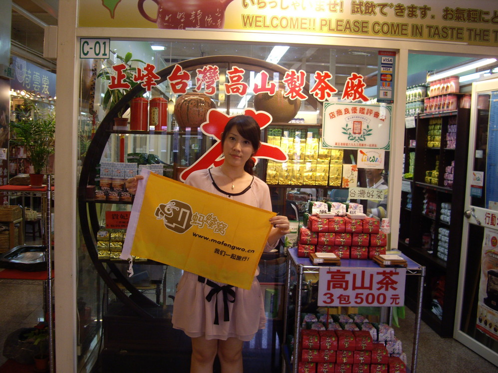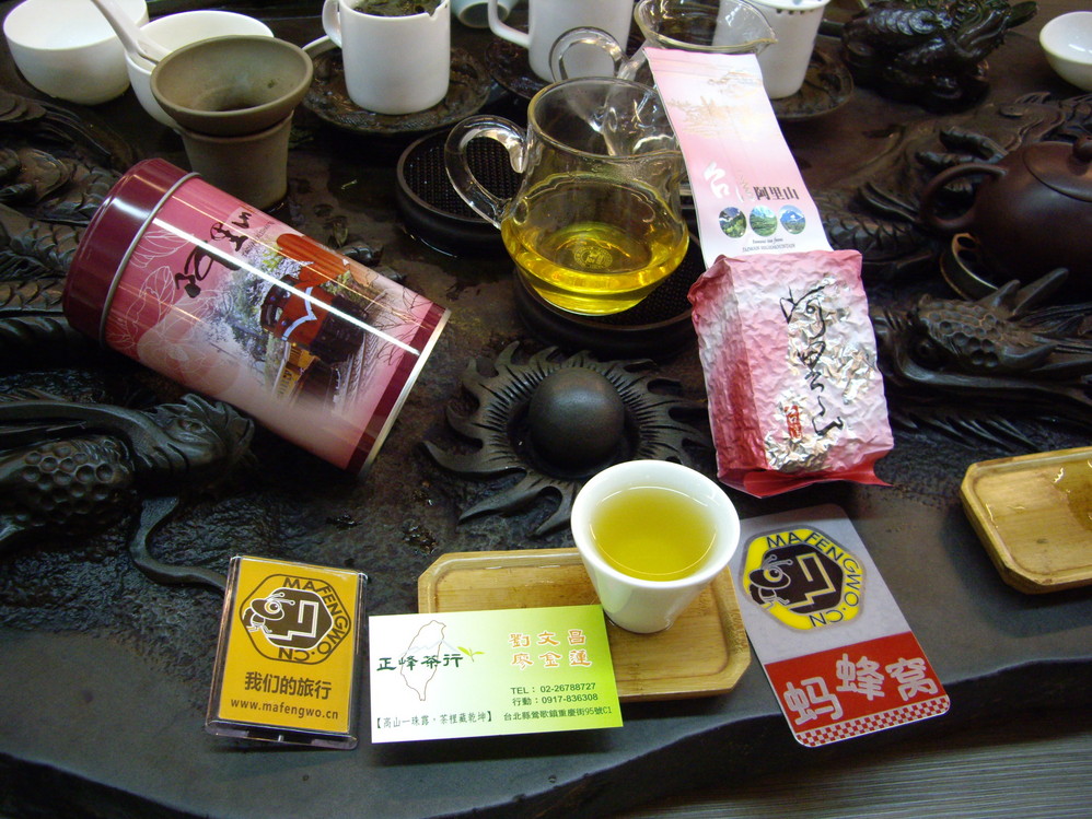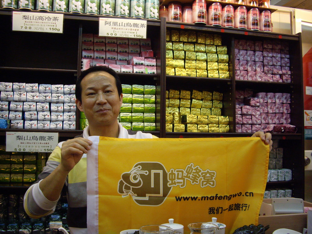 熱情的劉老闆, 大方 的幫我展示碼蜂窩的大旗.他背後, 台灣各山頭的好茶都有, 我喝了阿里山 ,梨山及大禹嶺的高山好茶.