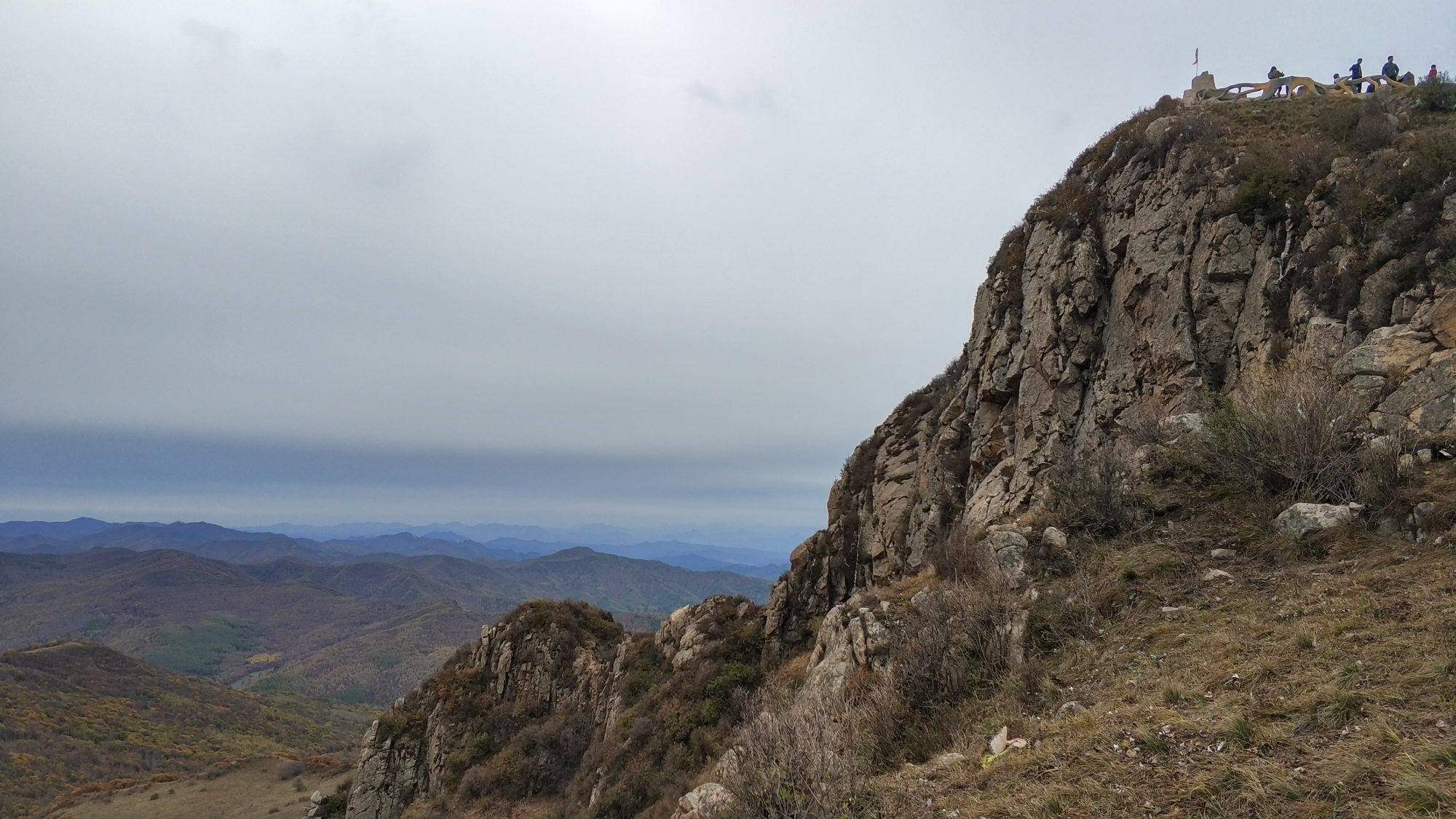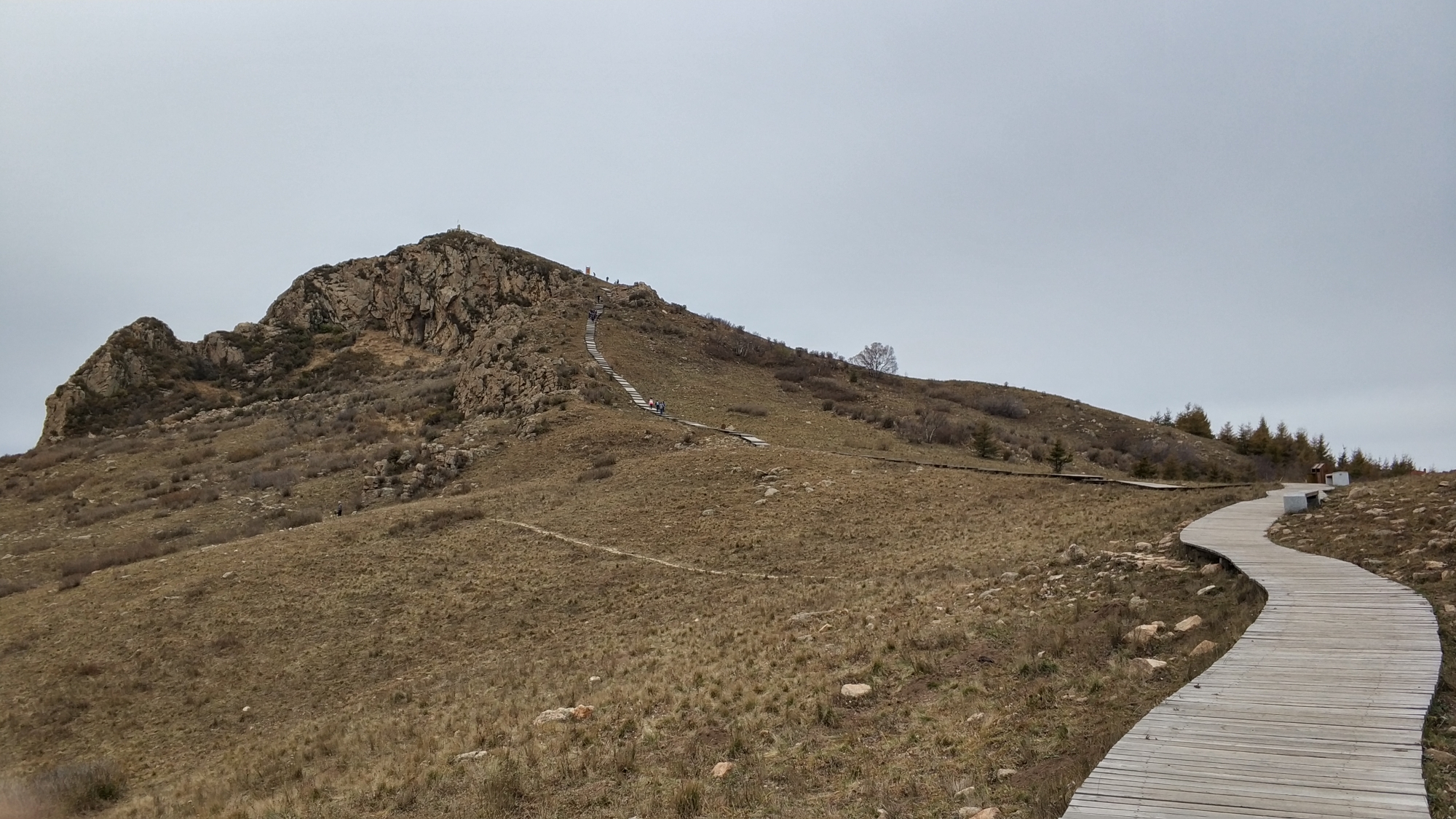 主峰海拔1750米,相对标高一百多米吧,木栈道曲折而上。