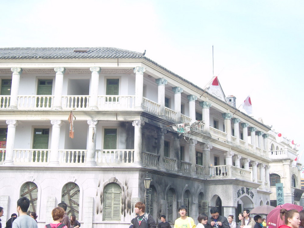 房子外墙火烧的痕迹、上面挂的日本国旗,这些都是电影《遍地狼烟》拍摄需要布的景……主演有何润东等……