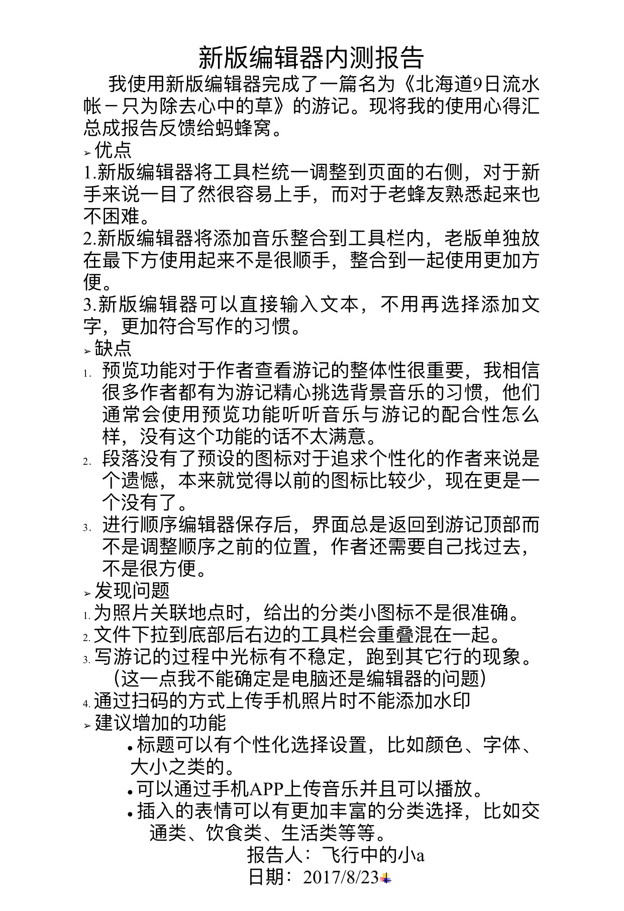 这是我参加新版编辑器测试时写的使用报告,令我感到高兴的是报告提交后,有些问题马蜂窝在后期打造编辑器的过程中真的做了修改,当然肯定不是我一个人的建议啦。