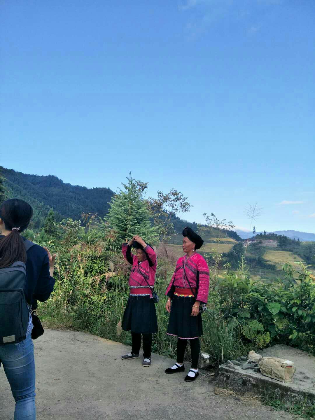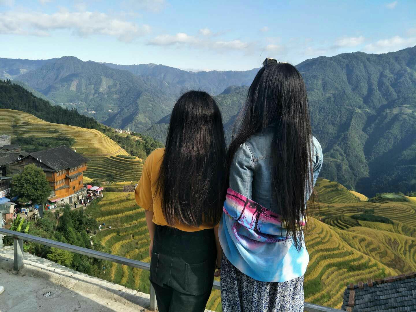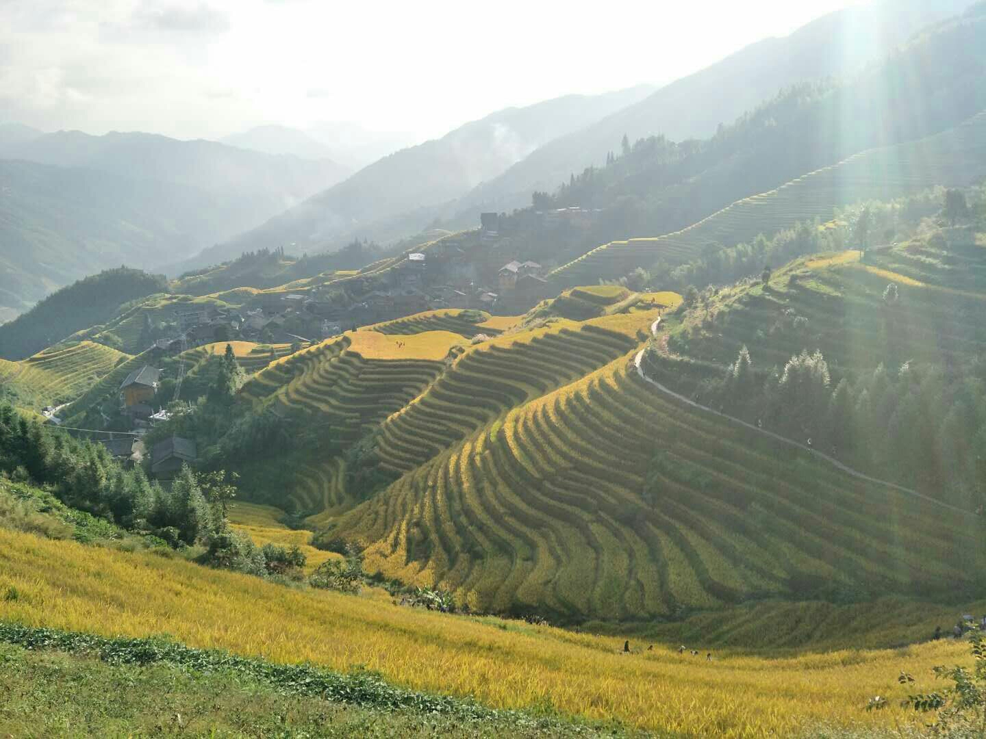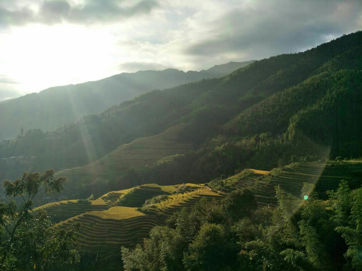 到了山脚下,我们便下车。老板娘说“你们等公交车或者班车就好了”。一脸懵的我们遇到了两位需要去桂林站搭动车回广州的小姐姐。拼车返程了。一路上互相分享了照片和这次旅行心得。小姐姐看了金坑佛顶,也坐了缆车。小姐姐玩了好多地方,也经历了好多,聊得不亦乐乎!su就是不吭声,我就是那个一直神采奕奕,精力旺盛的角色。车主平安古寨山行酒店老板,平安古寨人,像我们讲述平安是四寨子里面最美的景色。古壮寨比较清净接地气一些,平安夜景好看(可惜了,两个怕冷的人缩在被窝里)。金坑大寨里面有索道可以坐,俯览壮观的梯田,风吹层层麦浪。