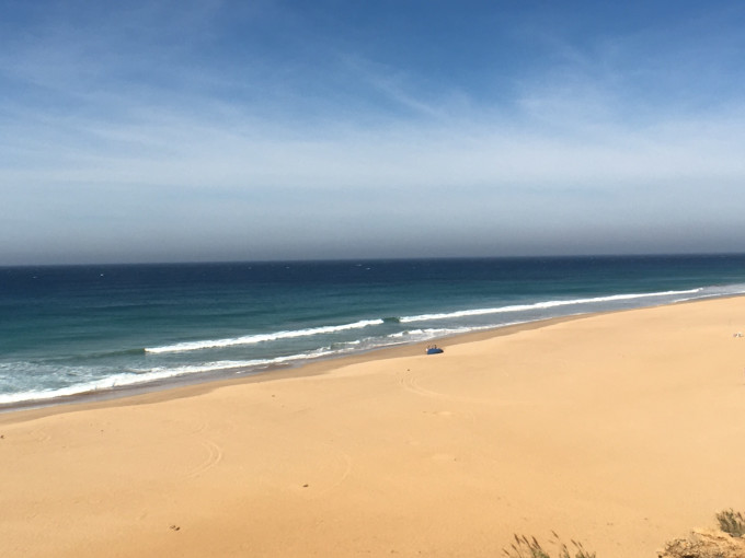 从艾西拉出发我们继续往丹吉尔走,沿路路过了美丽的沙滩大海,中午在一个海边餐厅,美美的吃了一顿。景色好,菜也还好。饭后继续往丹吉尔进发,去了非洲洞,真的很小的景点,但是却很形象。晚上入住了一个我们觉得很不错的城堡海边酒店。别墅形式,有泳池。可惜那天海边挂了7级大风,没游成