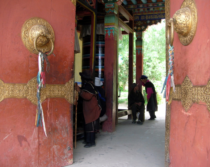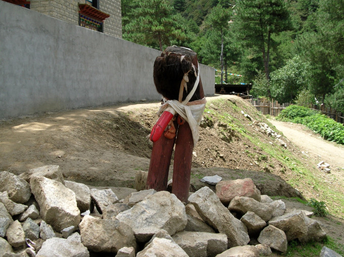 前往寺门的路边立着一个硕大的男根造型,据说是天然林木形成的,生殖器上系着信徒敬献的哈达;寺门左右两边分别立着一个男根造型和一个女性下身,生殖器维妙维肖,据说也都是天然形成的。这些都是信徒崇拜的生殖图腾。在这里,人们毫不避讳的、夸张的表达着对生殖的崇拜。