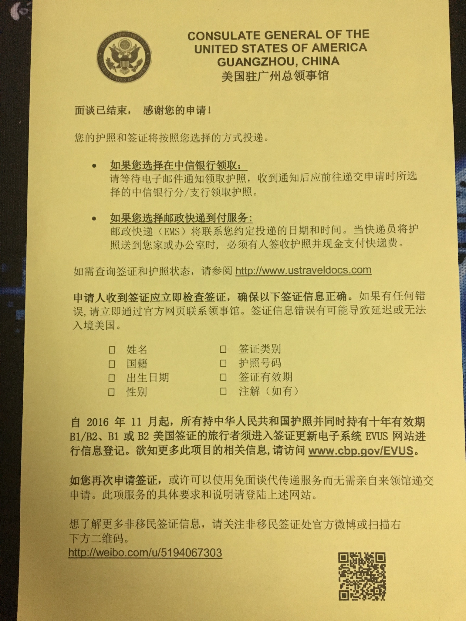 签证到手以后一定要记得登录美国海关和边境保护局(CBP)的官网www.evus.gov做EVUS登记,否则是无法入境的。