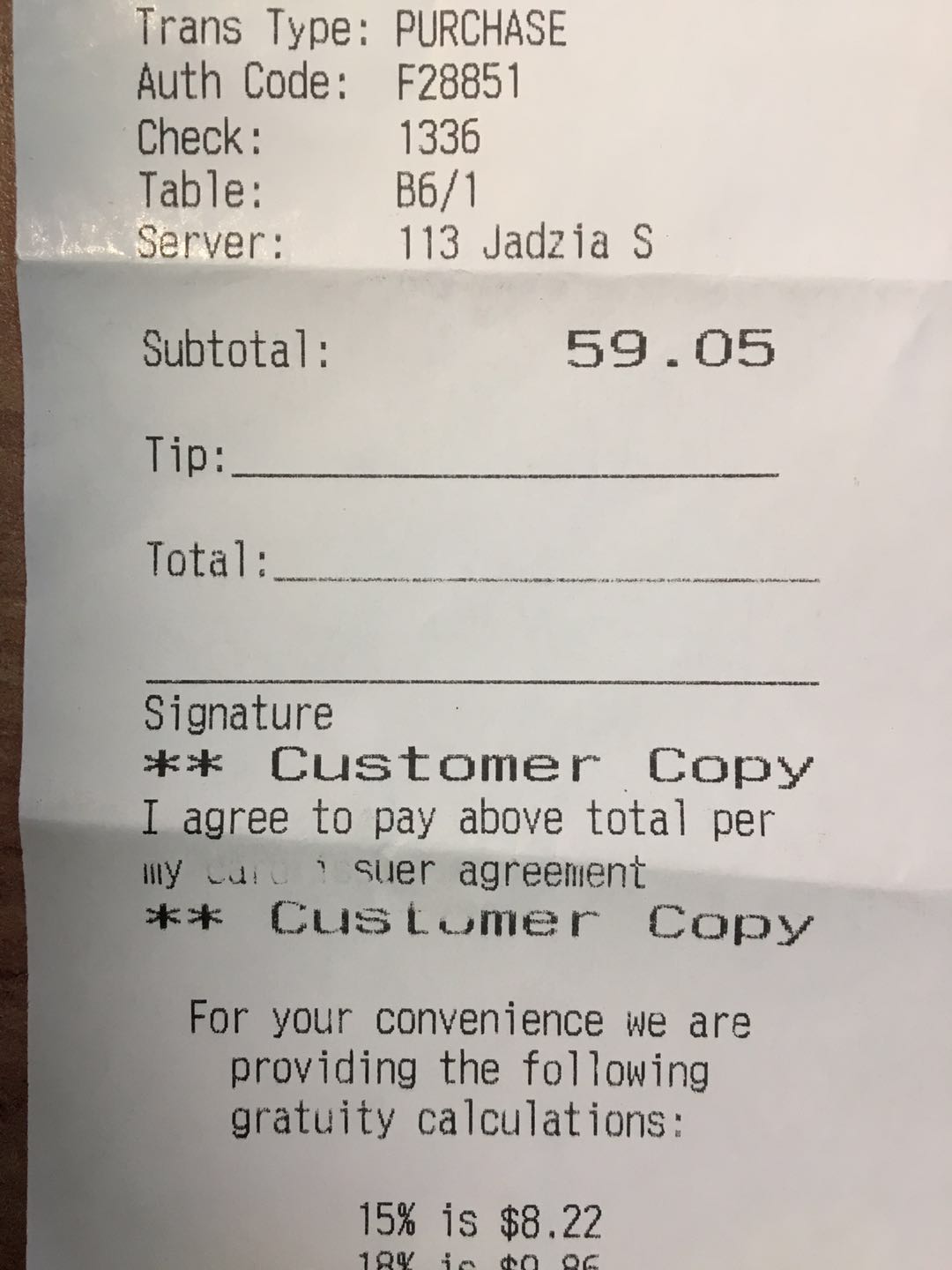 其次是在餐馆饭后支付的小费。用餐买单分为现金和刷卡两种,用餐后结帐时,餐馆一般会将账单明细递给你确认,确认无误后,用现金的则直接支付餐费以及小费后离开即可;用信用卡的,餐馆会进行刷卡操作预授权,将刷卡小票返回给你,小票分为三个栏目:餐费、小费(tip\gratuity)、总费用(total)。一般来说你只需要填写总费用,然后签字即可。我一般会采取10%取整的方式付款,比如说餐费59.05美元,10%计算非常麻烦,我就会直接在总费用(total)一栏上写下65美元,然后签字离开。餐馆会在你离开之后,按照你写下的总费用再进行扣款。