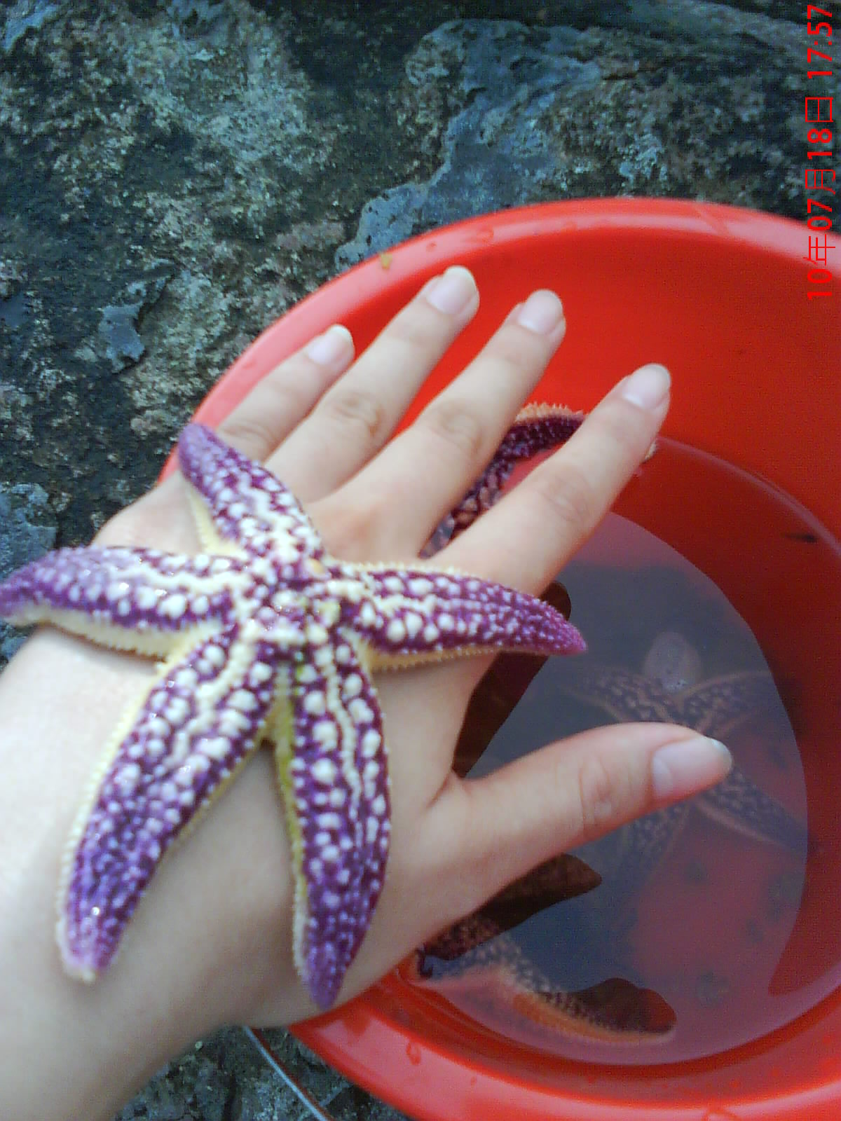 开始有点怕,不太敢摸,但这个小朋友鼓励我试一试。把海星放在手背上,能感觉到海星由僵硬到柔软,然后慢慢吸附,再慢慢和人熟悉,它好有灵性啊。
