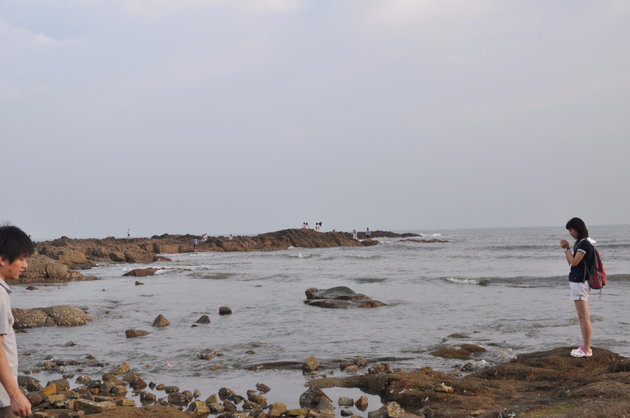 听到身旁有响动,发现一个大叔不慎把相机套掉下去了,幸好掉在礁石上,捡回来了。请他帮我拍了几张照,了却了和礁石大海合照的心愿。