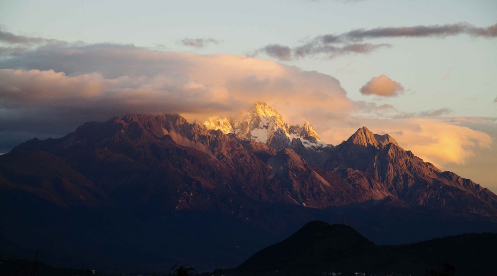 天刚亮,终于到丽江 了,一下车就可以看到很漂亮的雪山,还是日照 雪山,应该是玉龙雪山 吧,恩,是好的开始啊,呵呵。