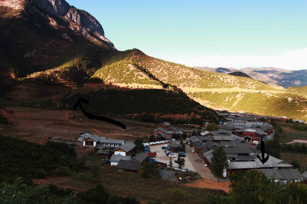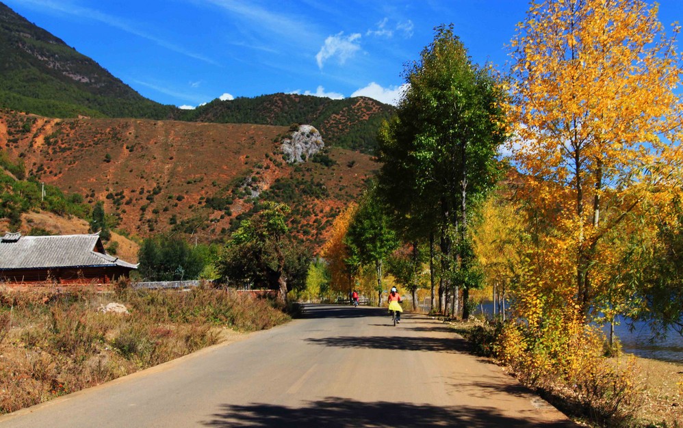 吃过早餐,准备路上的粮食,就赶紧去租自行车,60 块一天,然后根据昨天发现的捷径,顺时钟环湖去。说说我们走的捷径吧,就是从这里进去,一直往上走,就很快到里格村后山了,就不用饶个大圈走上坡路,大约省了15分钟的爬坡路吧。