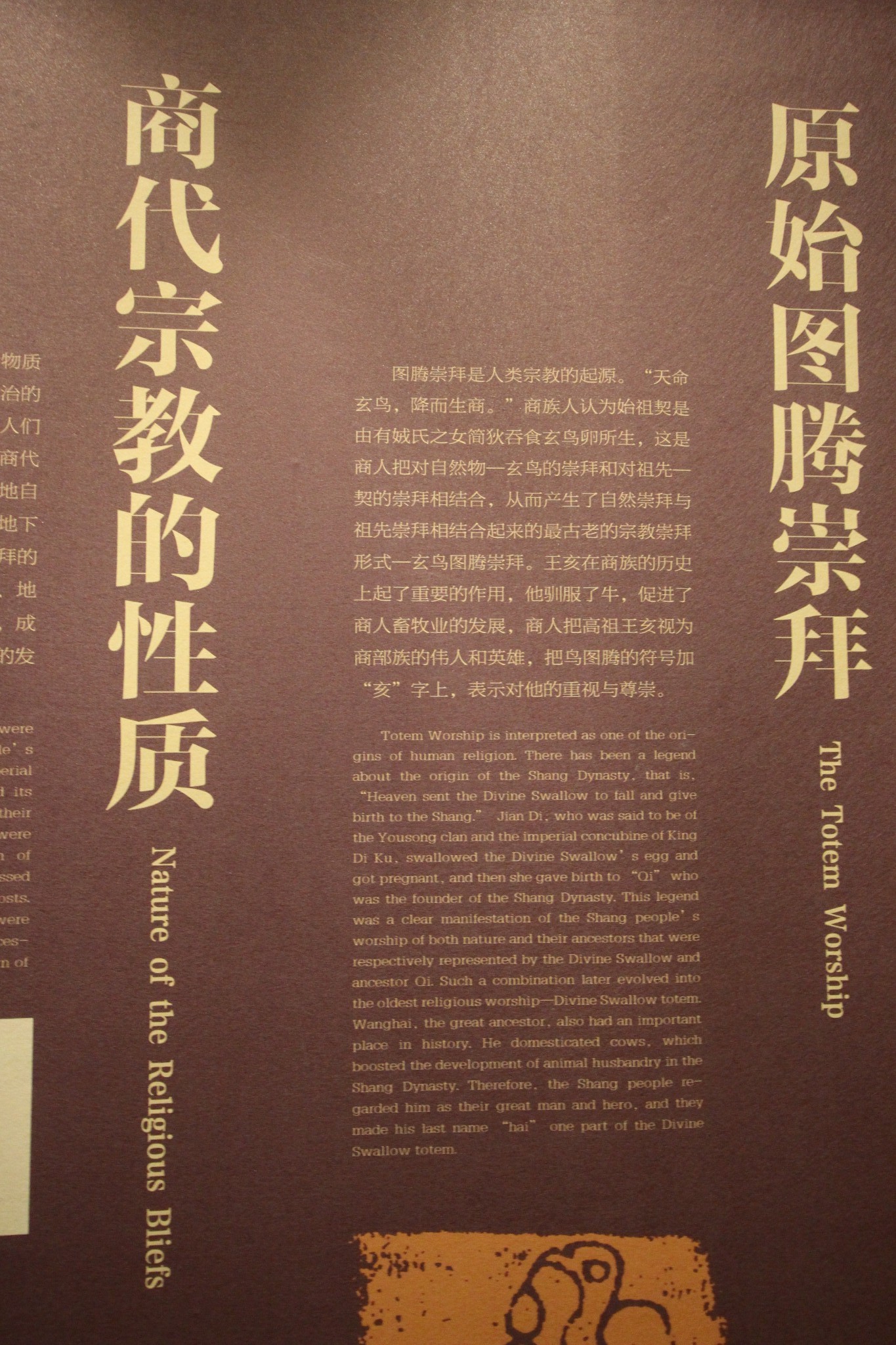 《史记·殷本纪》记载,商契的母亲简狄在郊外,因吞玄鸟之卵怀孕而生下商契。这就成为后人所谓玄鸟是商祖先这一传说的根据。玄鸟现代学者一般人认为是燕子。商人的祖先为东夷人,先秦时期居住在黄河下游和淮河流域的东夷人和淮夷人普遍存在以飞鸟为图腾的信仰。这一传说也反映出商人在简狄的时代还处在母系社会的末期,人们只知其母,不知其父,而从契开始,进入了父系氏族社会。