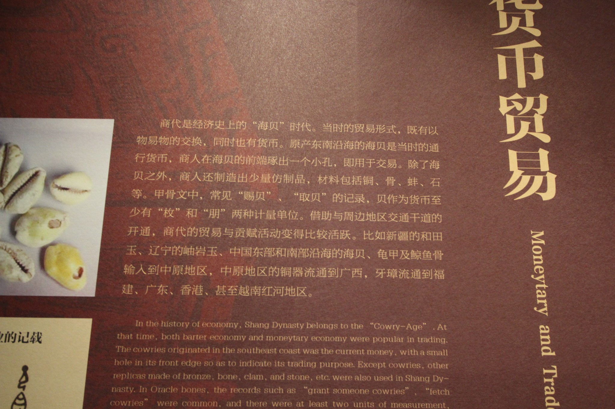 商王朝一直使用海贝作为货币。当时人们一般把海贝用绳子串起来。当时的商朝人已经脱离了以物易物的交易。不仅贵族贮藏大量海贝,在平民的墓葬中也经常随葬海贝。当时已经有了商业活动,并且已经有了地点固定的交易集市。当时的商人往往同时是手工业者,既生产品也出售自己的产品,从事农业的平民也如今天一样出卖自己的农产品和家禽家畜。当时商王朝的贸易有官方贸易和民间贸易两种。民间贸易的商品有食盐,陶器,玉器,小件青铜器,农具,渔具等。官营商业是官方经营的产业。商代有专职的商人为商王朝服务,还设有管理商品贸易的“多贾”。他们是从为王室经商的商人中挑选出来,专门管理官营商业活动的。