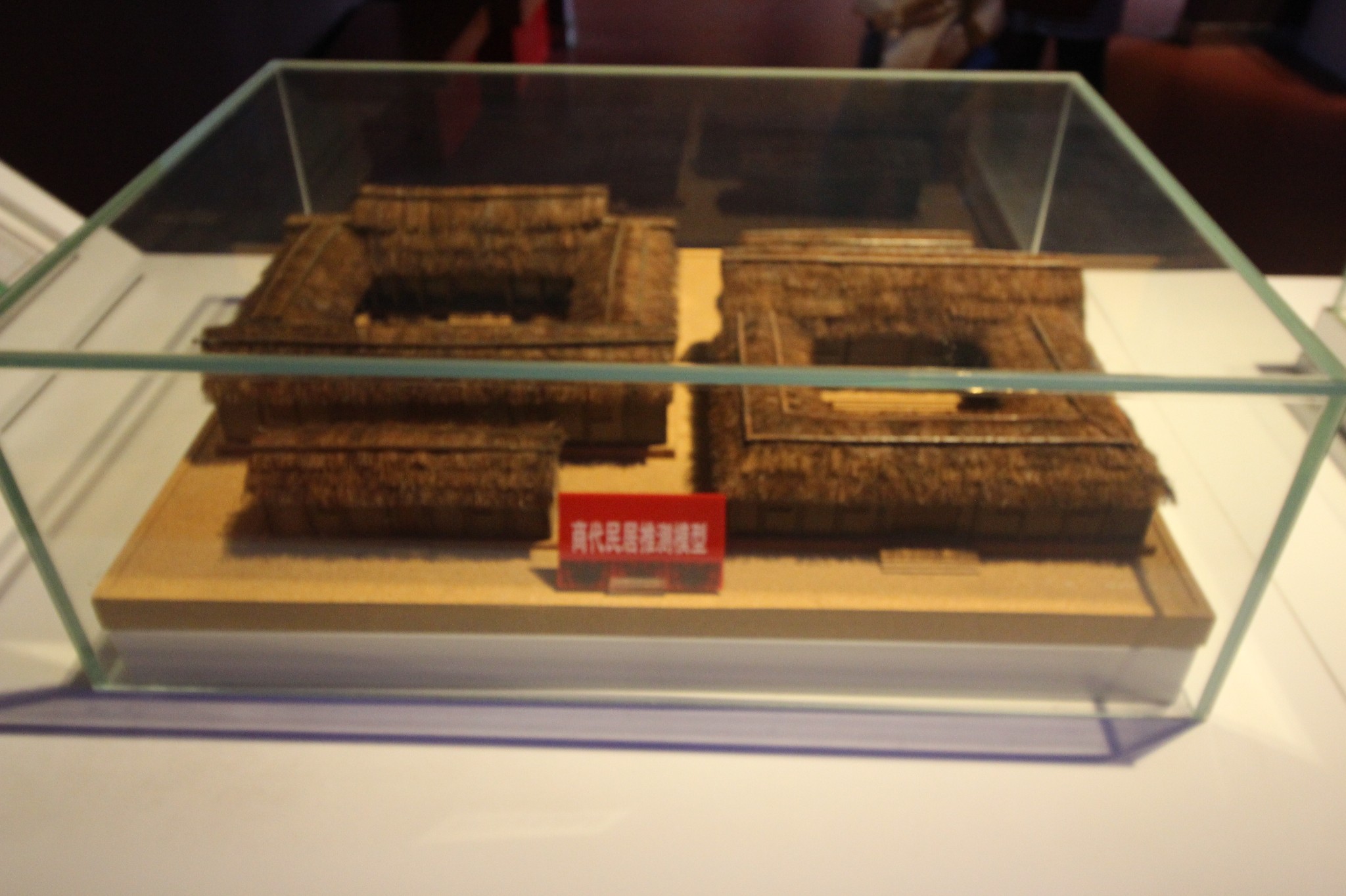商代民居复原模型。当时的中原地区已经有了类似后世四合院的建筑风格。当时中国江淮和长江流域的居民主要是住在类似今天傣族吊脚楼的干栏式建筑里,屋建木架上,离地有一定高度,这与当时南方原始森林茂密,水域面积十分广大,野兽众多,气候潮湿有关。当时的中国南方比今天水域更多,气候也更潮湿,野兽出没。