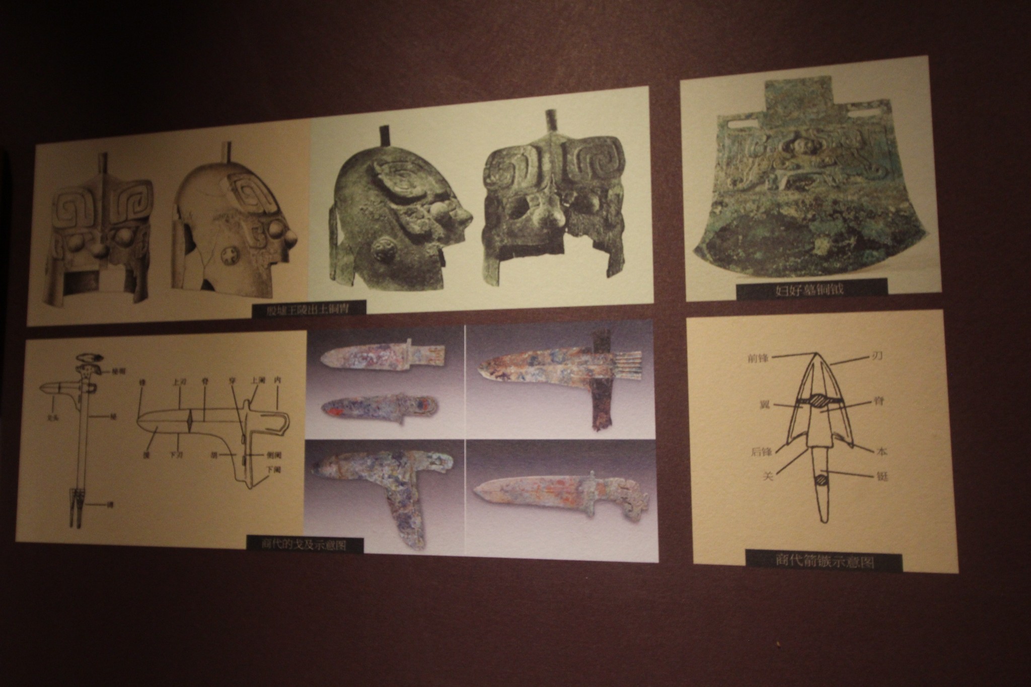 商代所使用的兵器主要有青铜戈、青铜矛和青铜箭镞。已经有了青铜胄(头盔)、皮木盾牌、皮甲、木甲等护具。而像今天大斧的青铜钺主要是作为指挥官的军事权力象征。当时的人在行刑的时候也使用青铜钺。