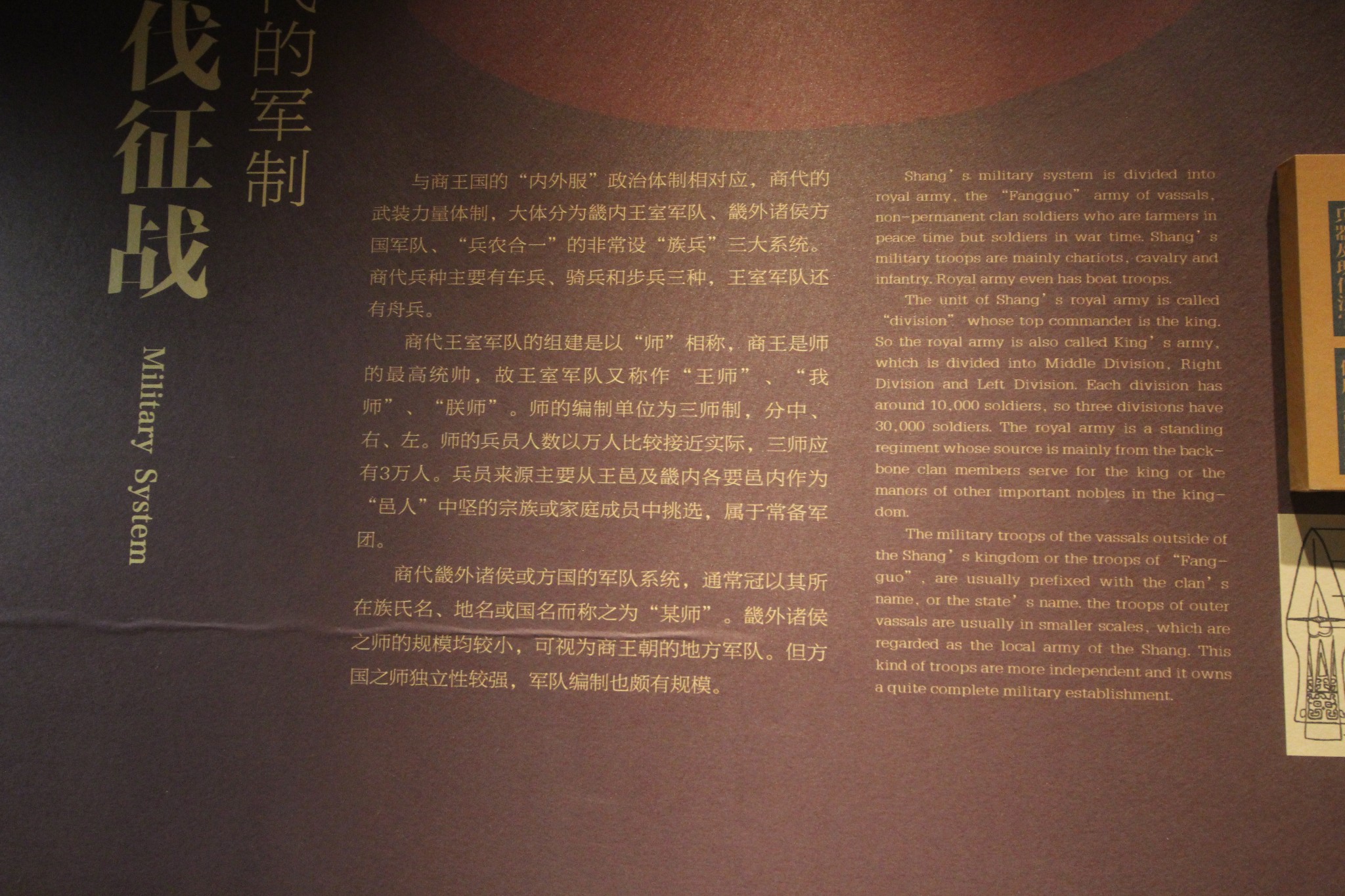 商朝的军队分为两种直属商王的部队,相当于后世的中央军,以及诸侯与方国的部队。直属商王的部队兵源主要是从都城和商王直属领土各重要城邑的宗族或家庭成员,属于常备军。而诸侯国的军队规模都较小可以看作商朝地方军,方国的军队独立性较强,军队人数也比诸侯国大。商代的官员分为内外服,诸侯和方国职官为外服,商王直辖领地的官员为内服。从商王朝的武官来说,直属商王朝的部队最大编制是师,其指挥官也称为师。商代骑兵部队(当时中原已经有了骑兵)称为马,其长官称为马或多马,弓箭部队称为射,指挥弓箭手的长官也叫射。而商王间接管理的诸侯国和方国,其国君称为侯、甸、男、卫、邦伯、牧、戍。他们既是诸侯国的首脑也是诸侯国军队的统帅,他们负有为商朝戍守边疆、出兵帮助商朝作战和缴纳贡赋的义务。商朝任命的官员主要是王室贵族和勋臣后代,这些官职基本上是世袭的,商王任用他们也会考虑到他们与自己的亲属关系远近、能力、功绩与品德,商王有权任命和罢免官员。除此之外还有像傅说这样为数极少的打破阶层界限破格提拔的人才。除了正式官职之外,商王也会根据需要临时任命官员。这些官员多半来自已经有一定职务的贵族,也有并无官职的贵族的兄弟子侄,少数情况下还会从俘虏、罪犯、奴隶中选拔杰出者为官。