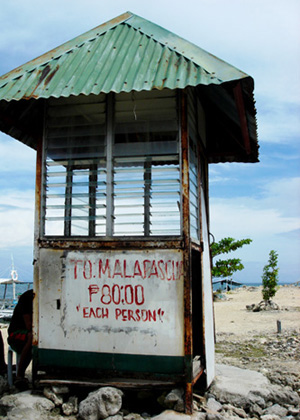 无人的售票窗口。之前也有听Anges说当天有拳击比赛,人们都会停工。等船闲聊时得知,她是日本人,独自一人来Malapscua潜水的。除开日本女生和我们外,又来了一位老美。那些拉生意的菲国人就在我们身边游说,想让我们四人包船去岛上,每人200P. 我们不同意,因为本来80P的价格,我得多付120P。早知道这样干嘛还在中间转车转船四五个钟,还不如找人合伙直接包船从Bantayan到Malapscua. 首先那日本人和老美软弱了,先上船。留下我们俩 ,那船家还是不甘心继续游说,别人都去看比赛不会有卖票的了。会不会有票卖我们当时心里是没有底的。最后以每人170P的价格成交(包括20P的驳船费)。也没便宜多少哎。