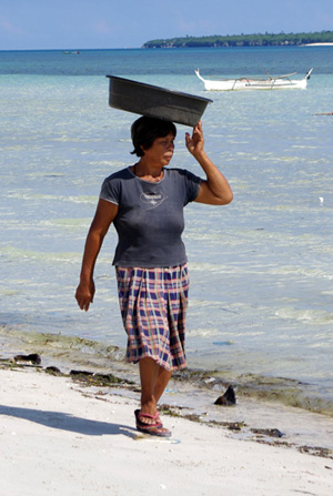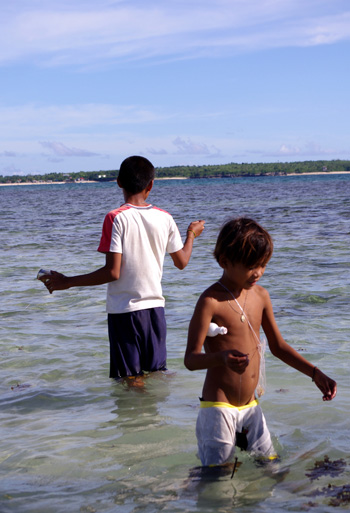 趁着Michelle帮忙回头去找船夫的空档,早起的我没什么事,就看看,海边路过的人,海里忙碌的人。一伙男男女女菲国人早上在海里捞捕海产品,过了段时间,其中一男的开始在海里游泳,游了会泳把上衣也脱了,直接在海里搓起衣服来,而后继续捞捕。这自由简单的生活方式真让人羡慕。 但如果,我是生活在这里当下的人应该又会是另一种心境。快到中午Michelle终于回来了,找到的是昨晚载我们的车夫,他联系人让我们出海。最终也是700P成交。