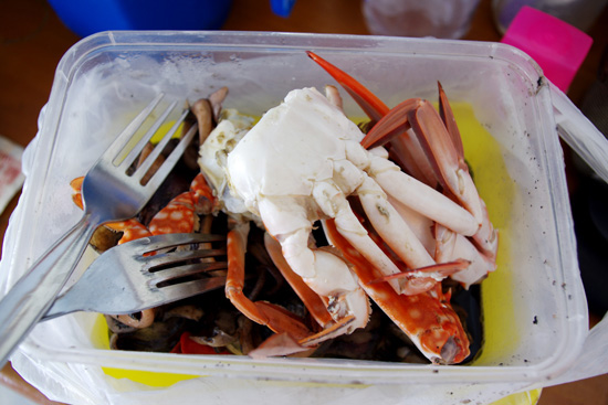 Michelle回头来找我,说不仅找到了做螃蟹的主,还可以在主人家买饭吃 。我当时真是又矇又惊的。不过这都要多亏Michelle的社交能力和活泼开朗的性格。而这正恰恰是我所缺乏的。其实是船家在岛上的侄子家,一个28岁小伙和一个18岁姑娘以及一个2月大婴儿组成的一家庭。由于当时是午饭时间,他们家正好也在吃午饭,所以就地取材的从他们那买到了些已做好的鱿鱼和些饭,还有我们的那只螃蟹。我们问他要多少钱,小伙很腼腆的说随便你们。最后给了100P,真不知是多还是少了 ,开发区和原始区的消费真拿捏不准。 自然营养又美味的食物(下面黑黑的就是鱿鱼 )。