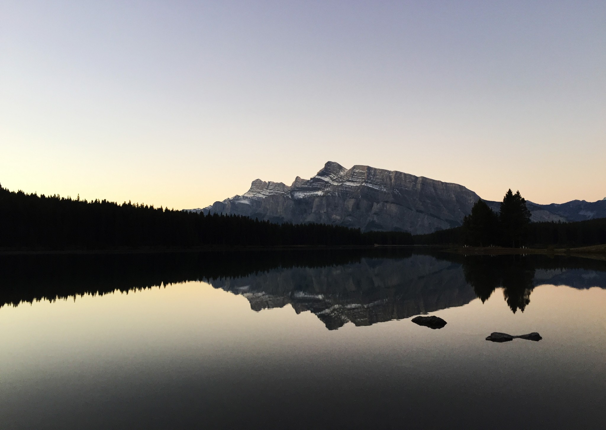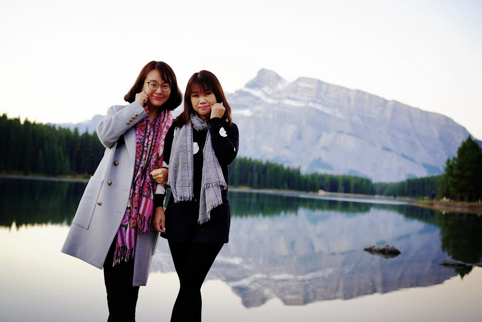 为了看日出,一大早我们就起床,其实这个时间段,日出时间还是比较晚的,大概7点才开始,所以6.30到达景点的话时间非常充足。从坎莫尔开车去双杰克大概半小时,去路易斯湖要一个小时,虽然路易斯湖的日照金山非常有名,但是据说观景台人超多。自然了,如果你住在费尔蒙城堡酒店的话,酒店有自带观景台,就不存在人头困扰了。于是我们选择了双杰克湖看,没有密密麻麻的人头,大家都架起相机拍延时,位置足够。湖面很干净,又没有风,真是个拍日出的好地方,开始我也为我的英明决定沾沾自喜,可是后来却错过了在班夫最想看的Moraine Lake梦莲湖,后悔的一塌糊涂,宁愿去看密密麻麻人头的路易斯湖日出,