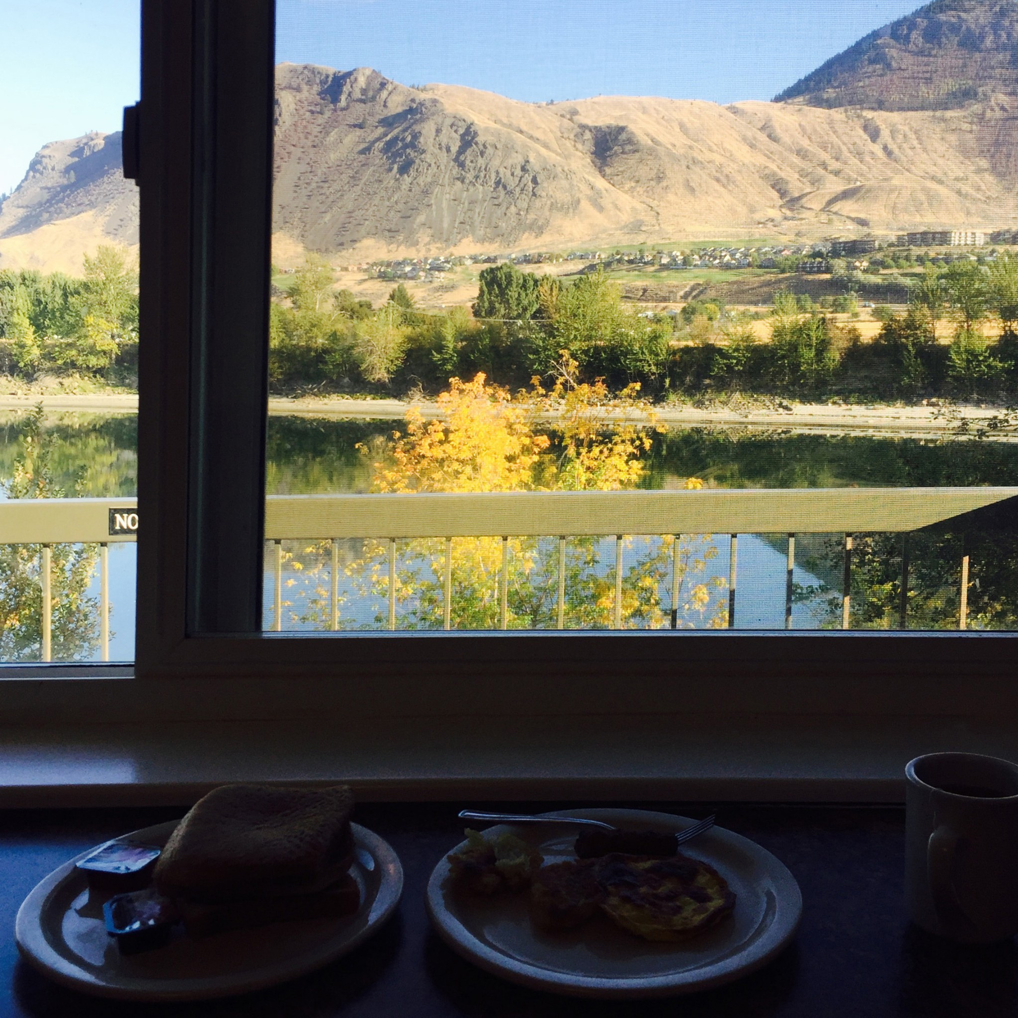 19:35从香港出发,27日下午16:20抵达温哥华机场,租车公司Alamo就设在温哥华机场附近,走过去几分钟,很好找。免费给我们升级成7座巨大车,打开车门就有自动台阶伸出来,踩着才能上下。因为旅店在kamloops坎卢普斯,所以没在温哥华停留,马上出发去坎卢普斯,竟然还有一小时的时差。大概四个小时后到达坎卢普斯,入住Riverland Inn&Suits,第二天早上起床后,才发现酒店风景很好,尤其在餐厅坐着早饭时,心旷神怡。