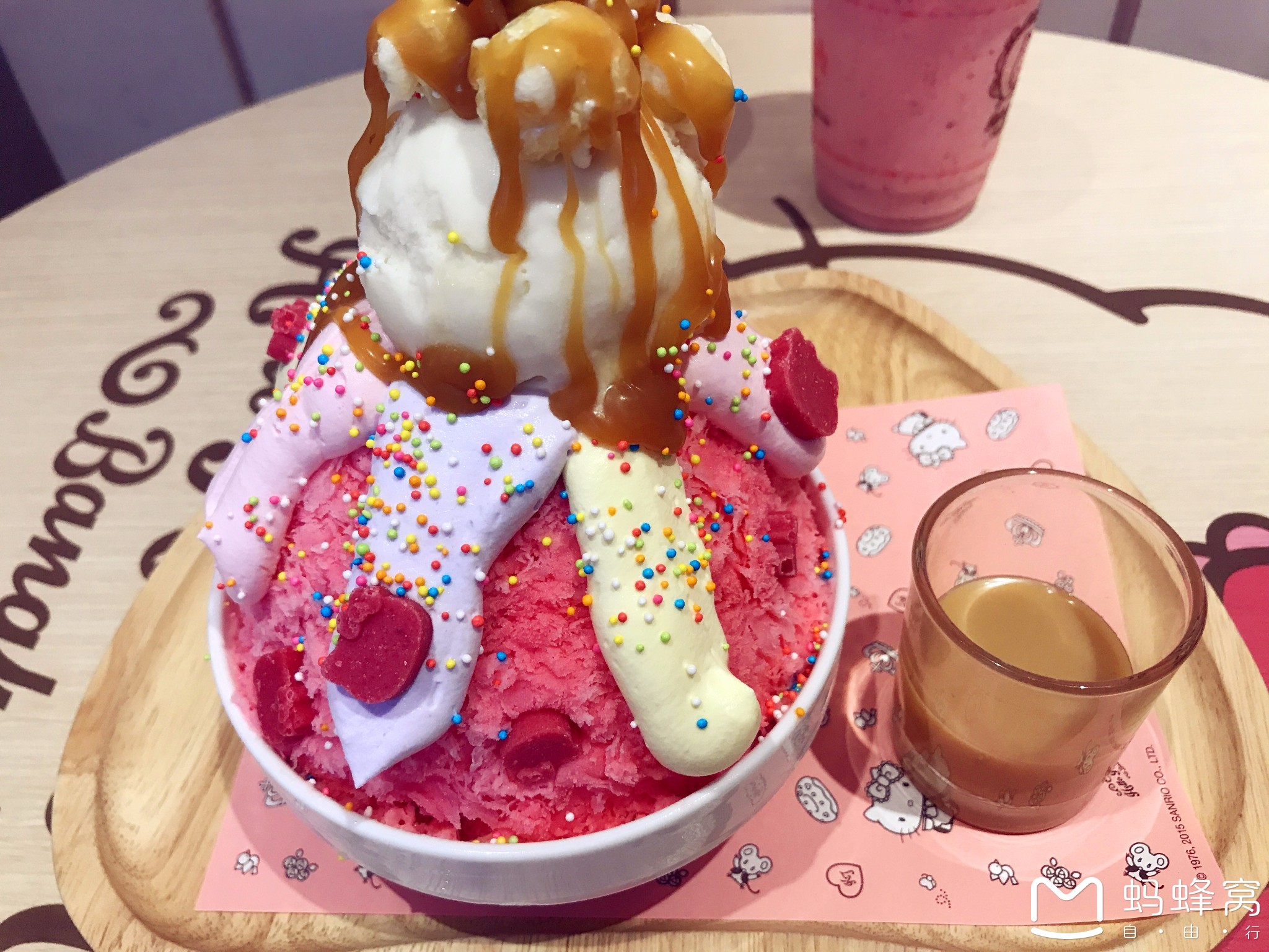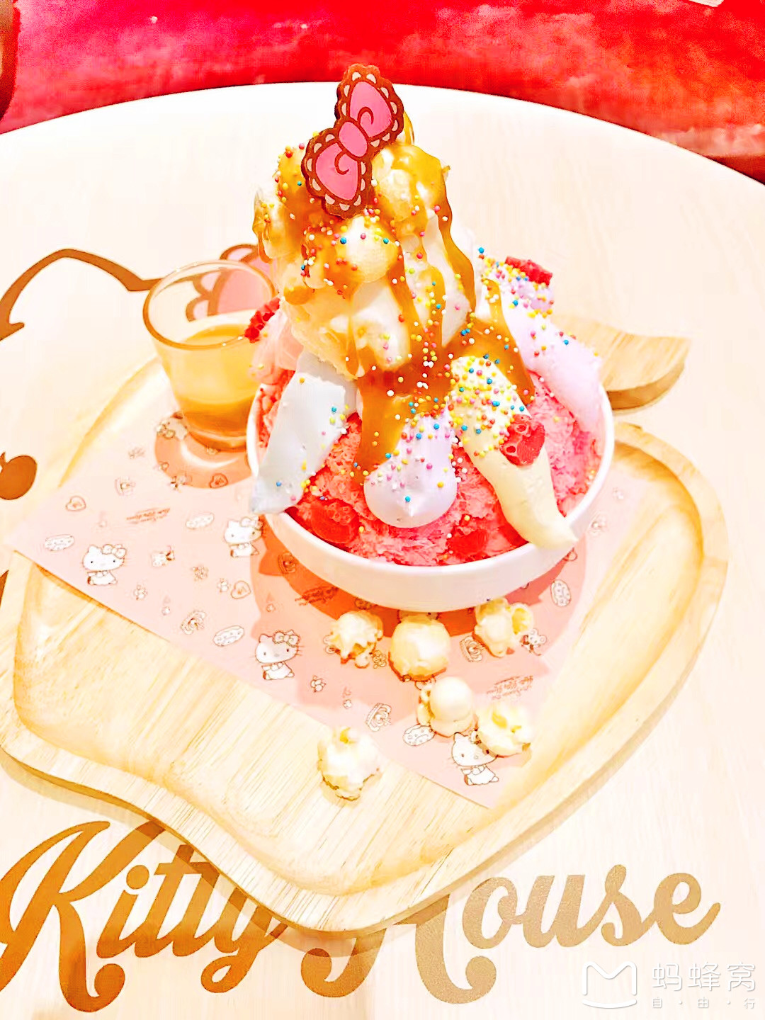特色甜点:底部用爆米花垫底,中间粉红色是研磨很细腻的冰沙,上面正在涂上奶油,最上面是牛奶冰淇淋球,周围还零星撒上HelloKitty头型的粉色糖果。您还可以根据自己的口味选择,淋上太妃糖口味的焦糖汁。
