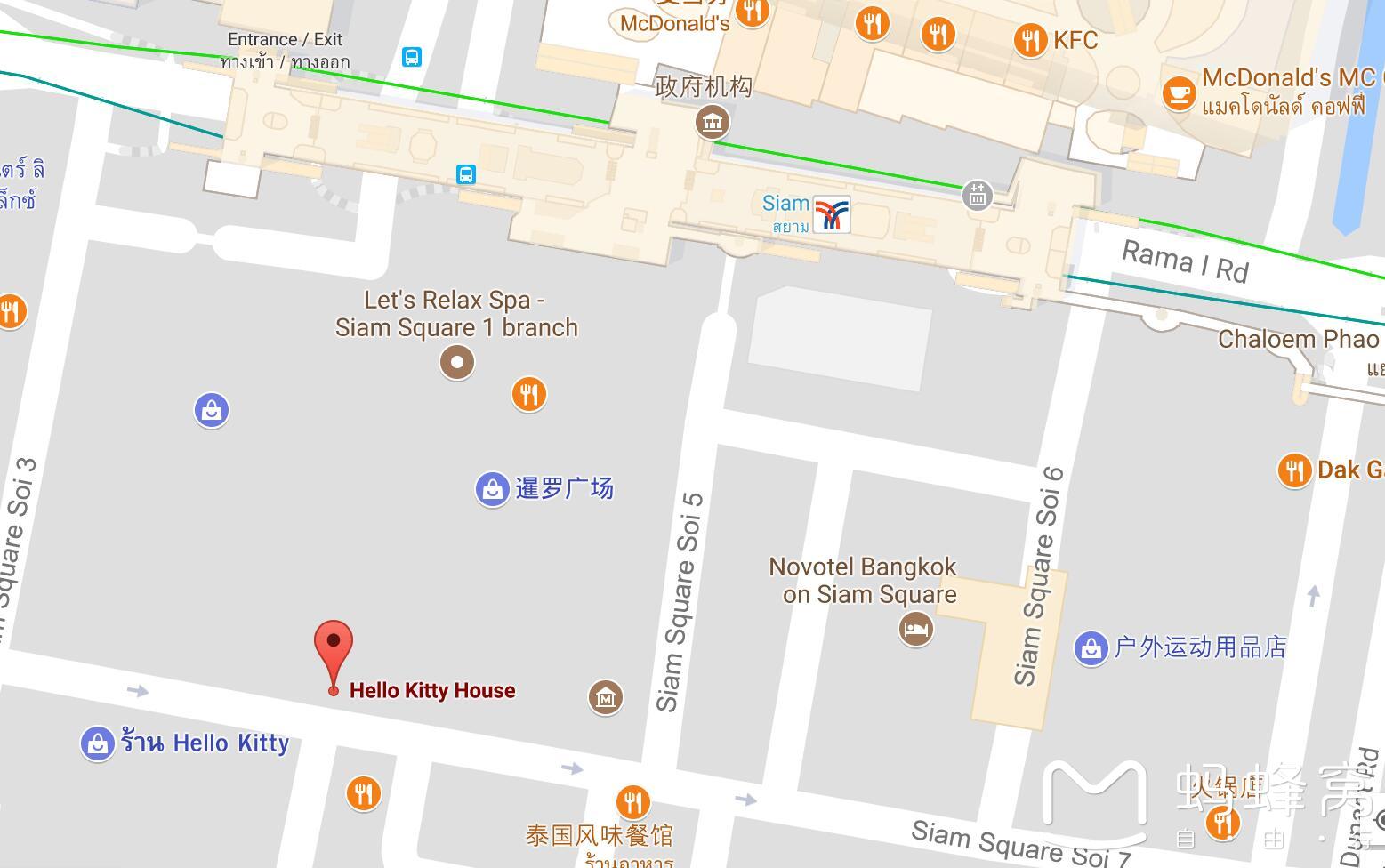 距离Sanrio Hello Kitty House曼谷最近的车站是暹罗车站(BTS SIAM),距离这个综合大楼约240米。可以直接穿过SQ1就到了。
