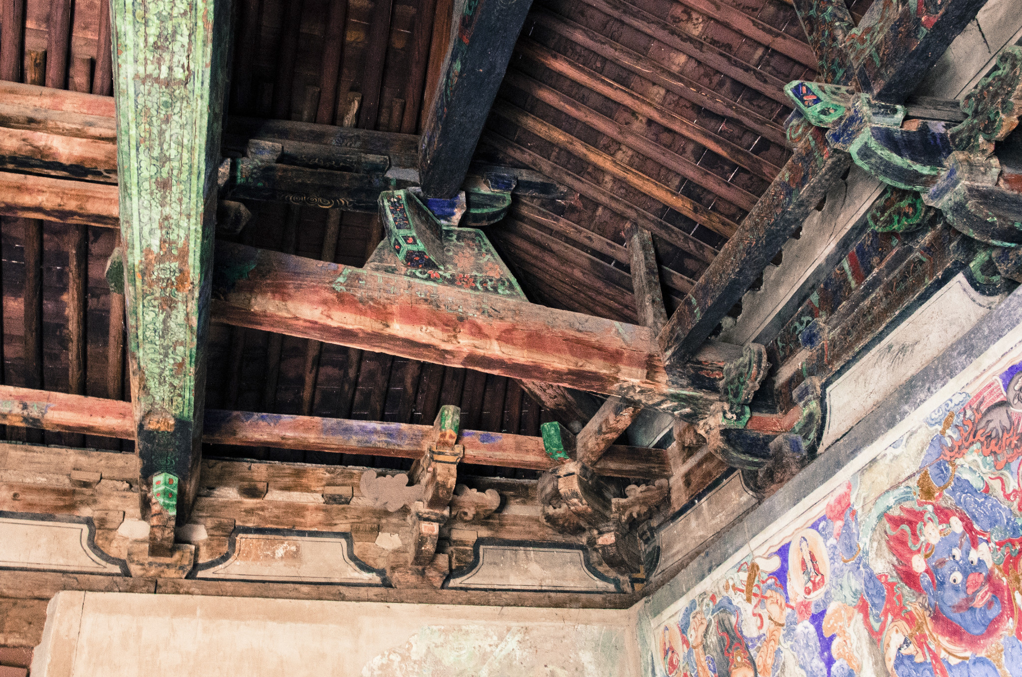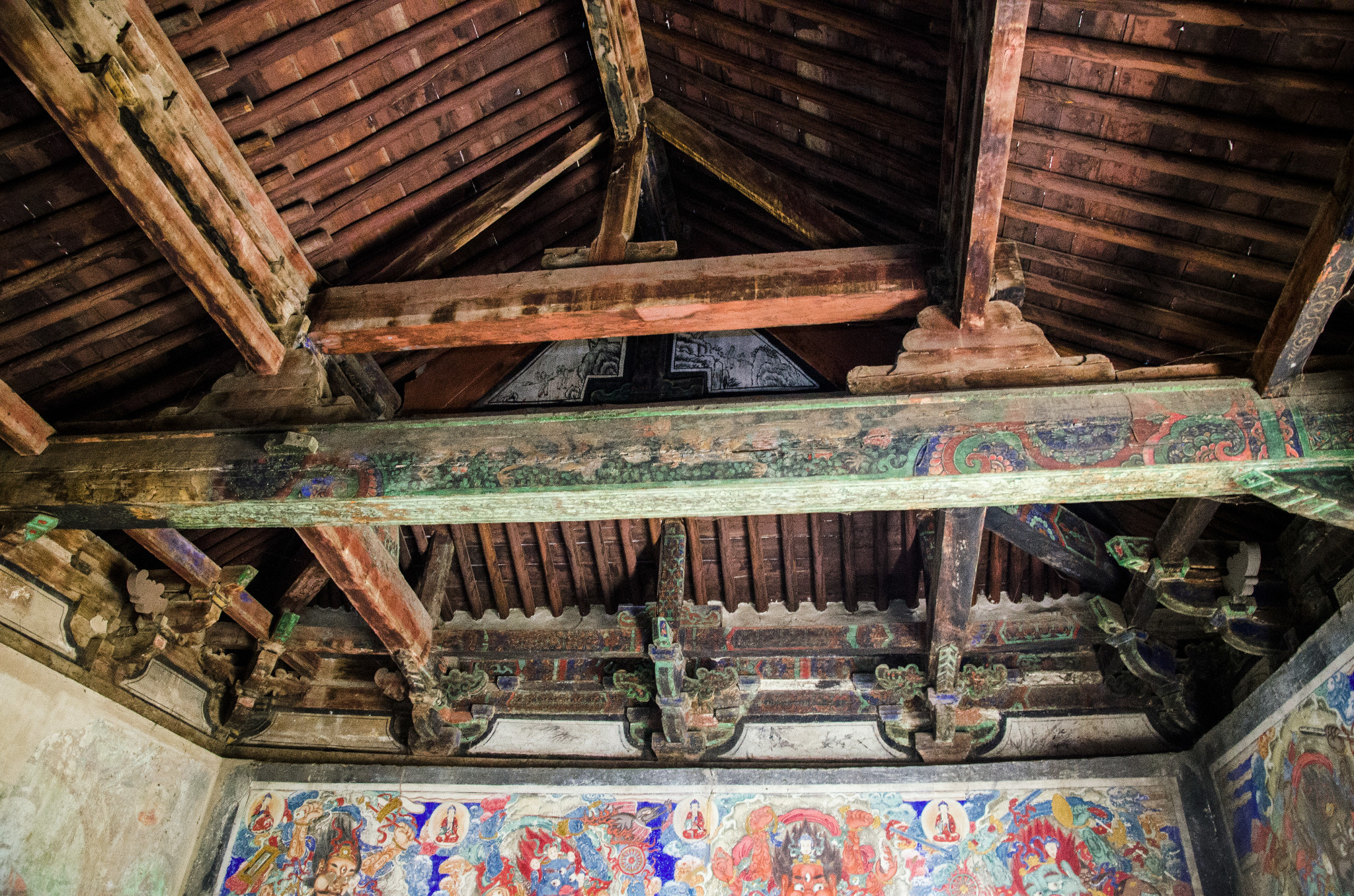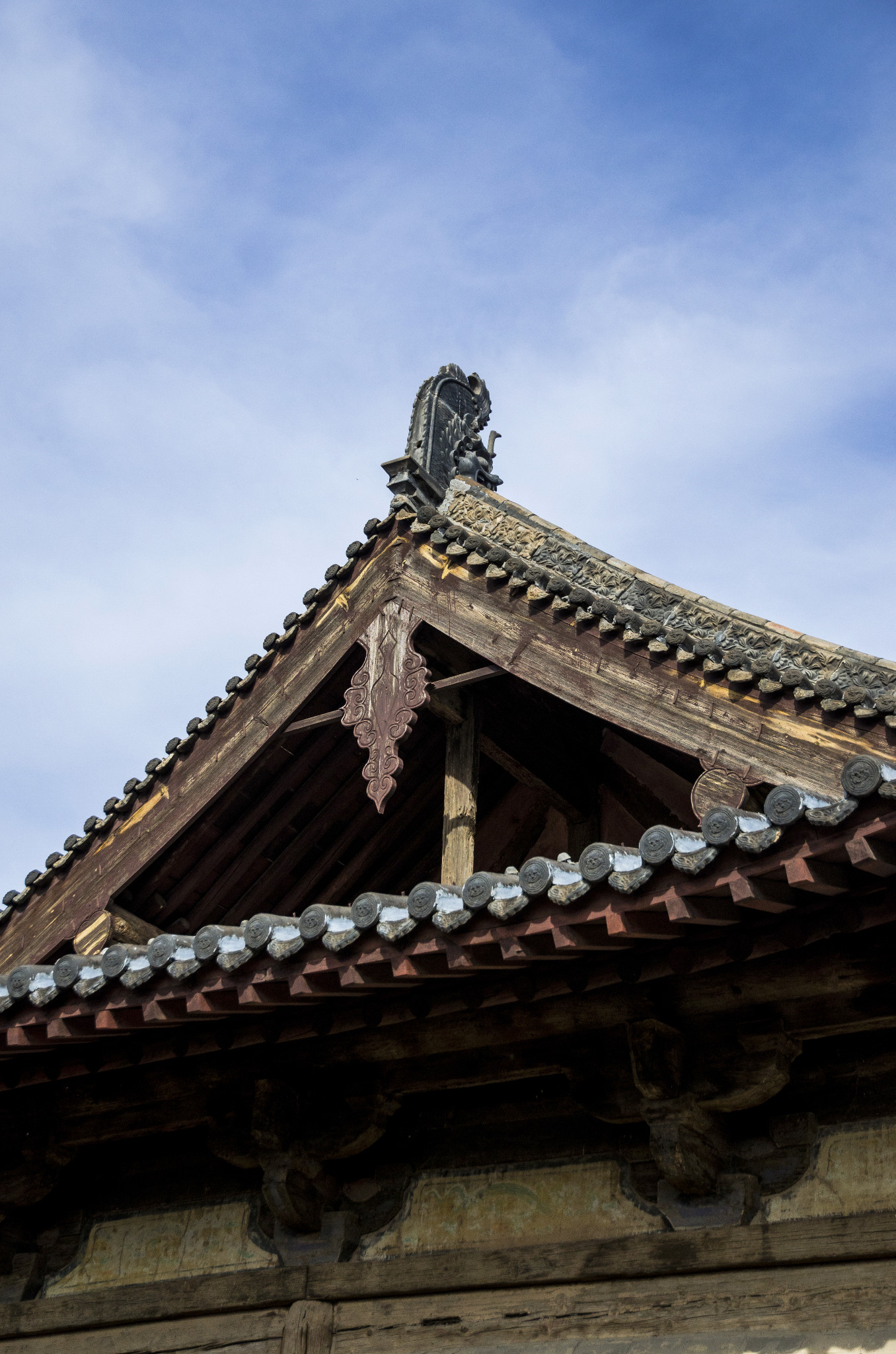 大雄宝殿,金代遗构,元、明、清均有修葺,举折平缓舒展,翼角升起显著。
