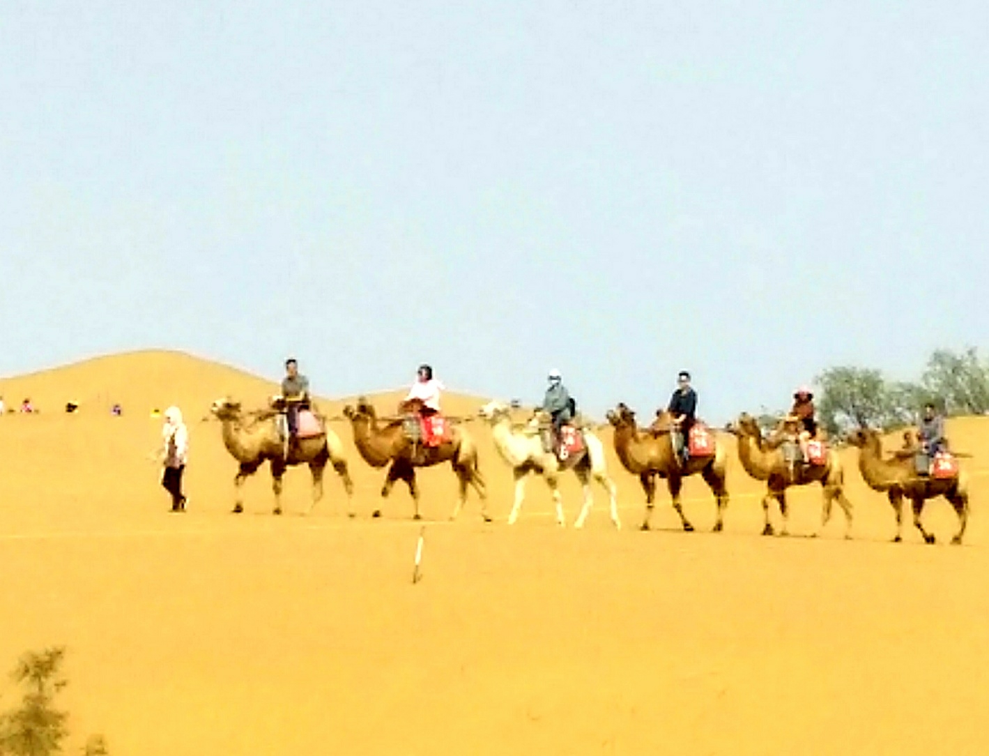 天气干燥炎热。被誉为沙漠之舟的骆驼大队仍不知疲劳地行走在沙丘上。
