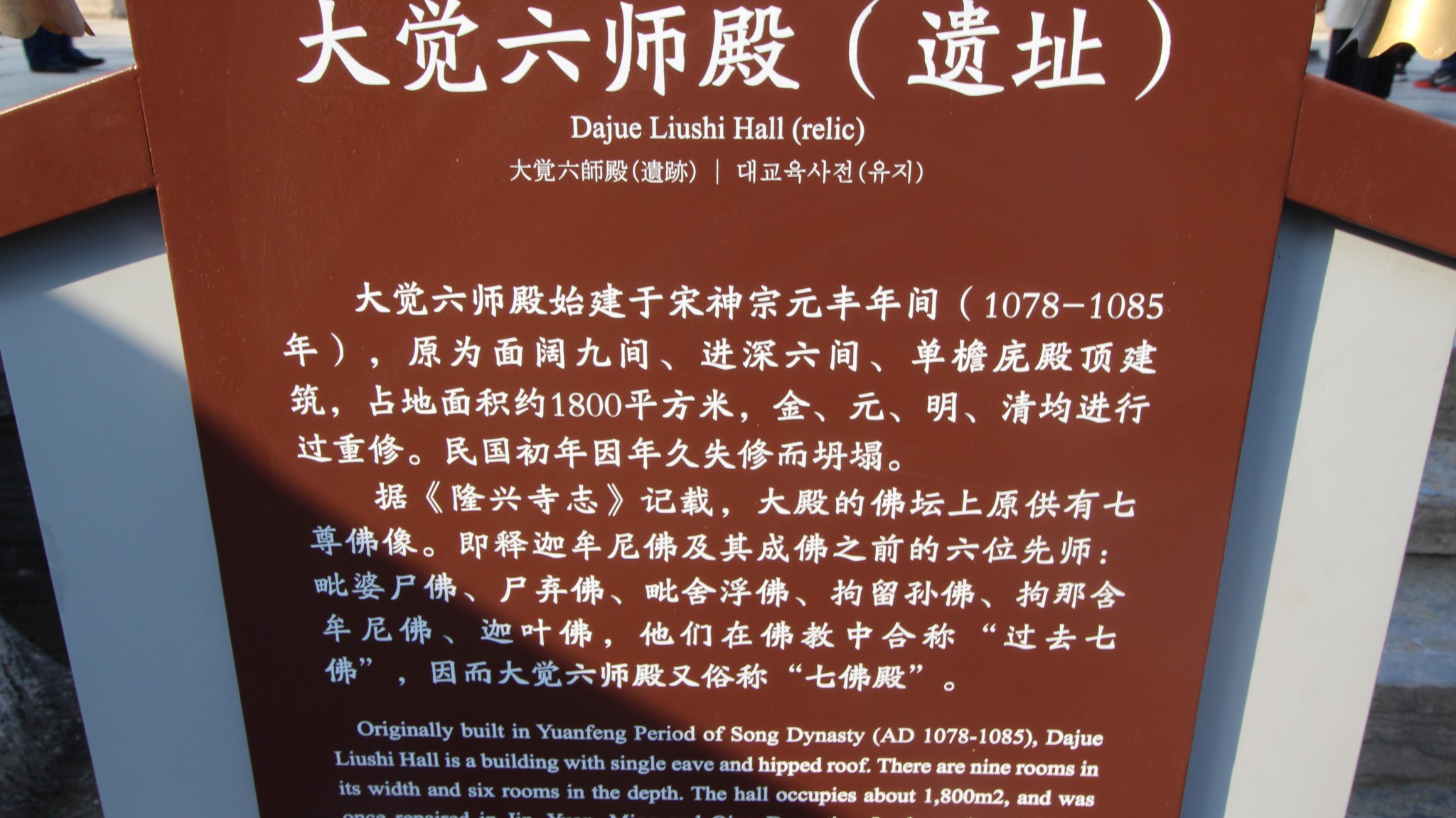 天王殿后是大觉六师殿的基址。它始建于北宋元丰年间(1078-1085年)巨大的台基和柱础昭示着它往日的恢弘壮丽。它曾是寺内的主殿。面阔六间,进深九间,庑殿顶,是寺内最大的建筑。据史料记载,大觉六师殿佛坛上供奉佛祖释迦牟尼和他成佛以前的六位先师,殿内五彩石罗汉有108尊,高一丈六尺的金装佛3尊,高一丈六尺的金装菩萨4尊,还有五彩护法神3尊,五彩佛像4尊,五彩泥塑罗汉53尊,殿北又有五彩菩萨5尊,五彩悬山4座,前后墙上都是彩绘壁画,恢弘壮丽。令人无比遗憾的是在民国初年,它却因为战乱和年久失修而倒塌。