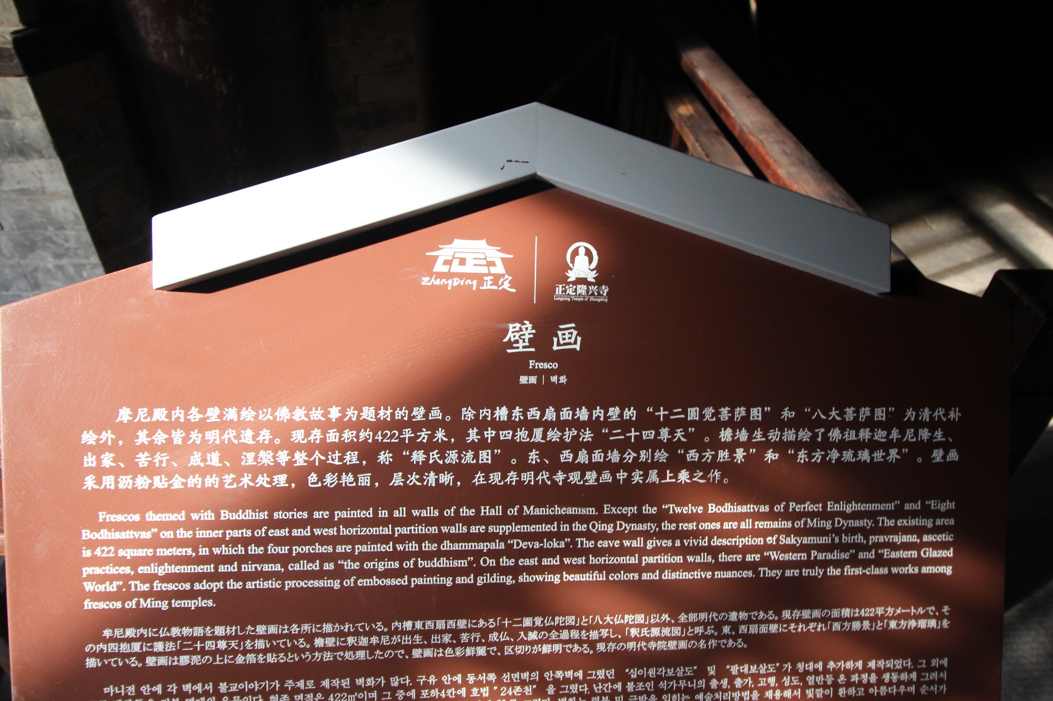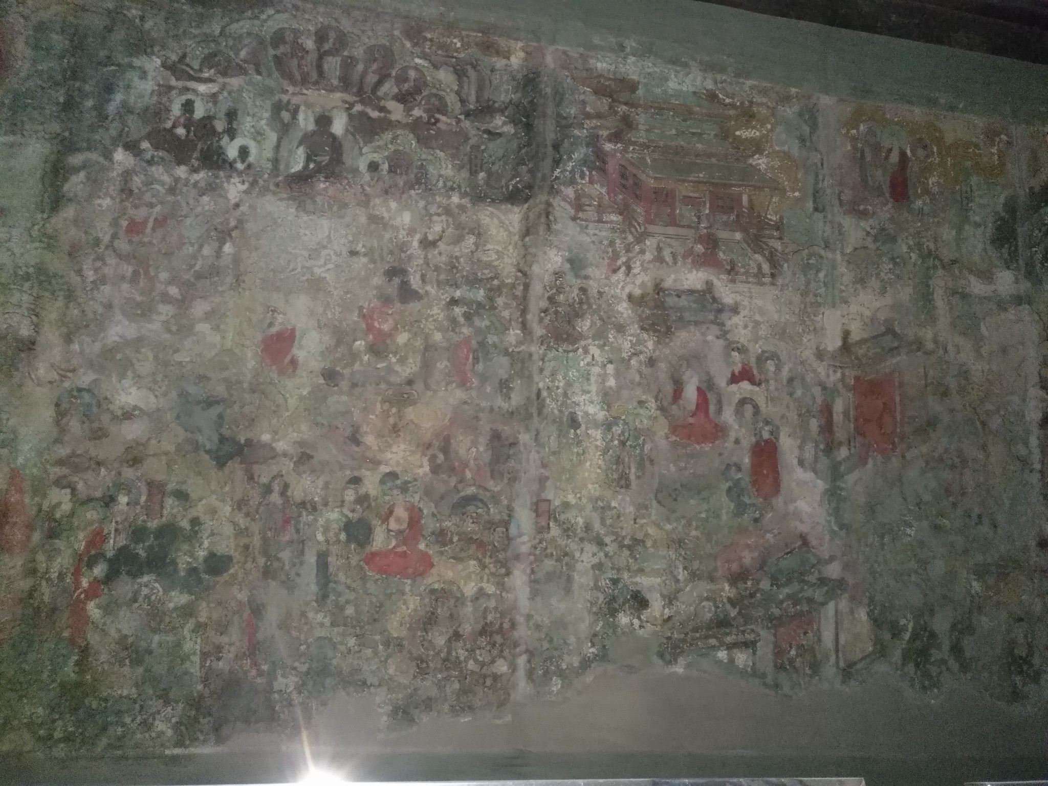 在摩尼殿大殿的四周是明朝成化年间(1465-1487年)所绘的巨型壁画,外层壁内采用"分幅兼通景"的布局,描绘了释迦牟尼降生、出家、苦行、成道、涅槃整个过程。
