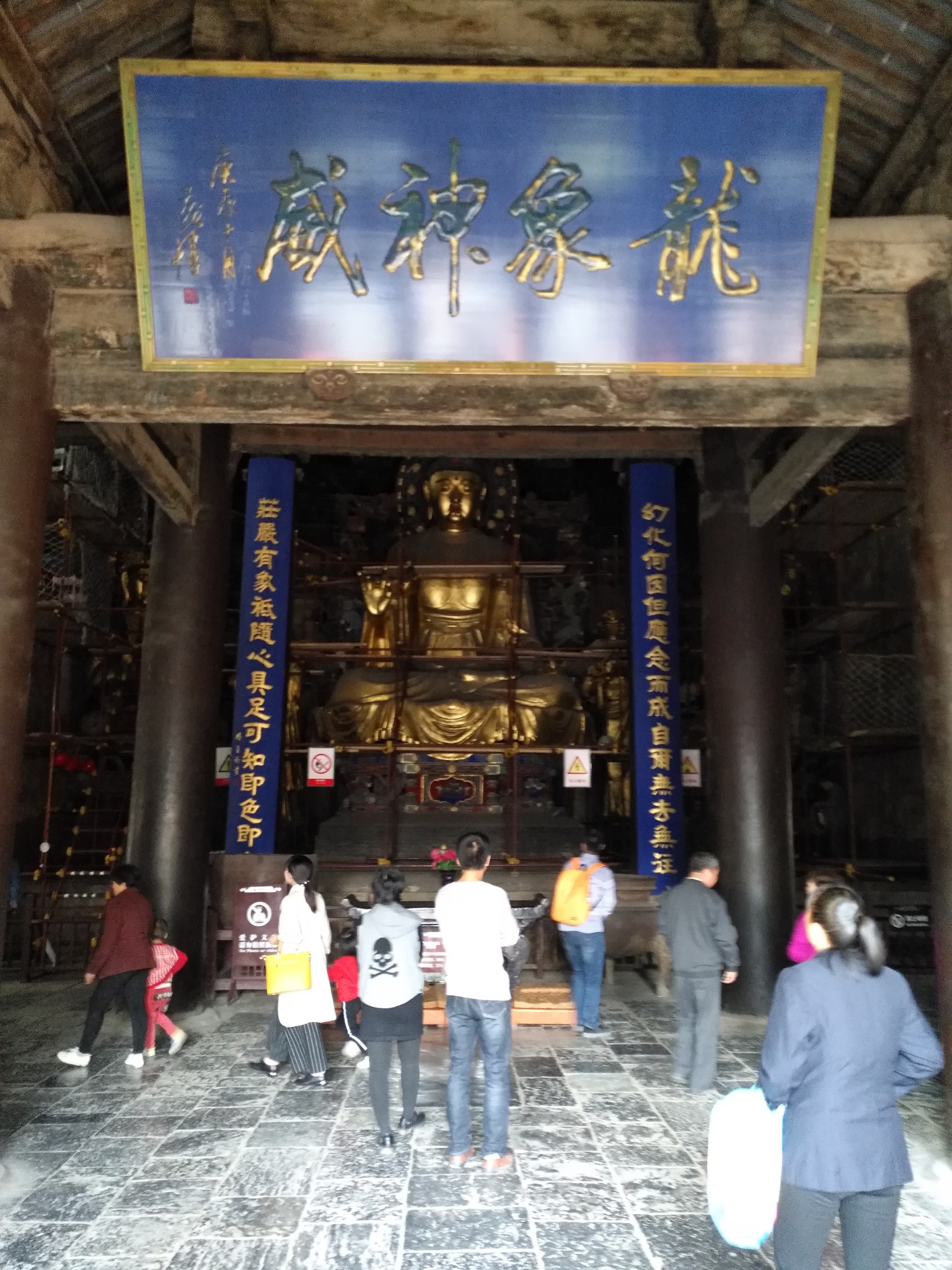 隆兴寺的天王殿建于北宋初年,是这个宏大宋代建筑群中,建造年代最早的一间大殿。殿正中有一尊金代木雕大肚弥勒佛,两侧是现代重塑的风调雨顺四大天王神像。
