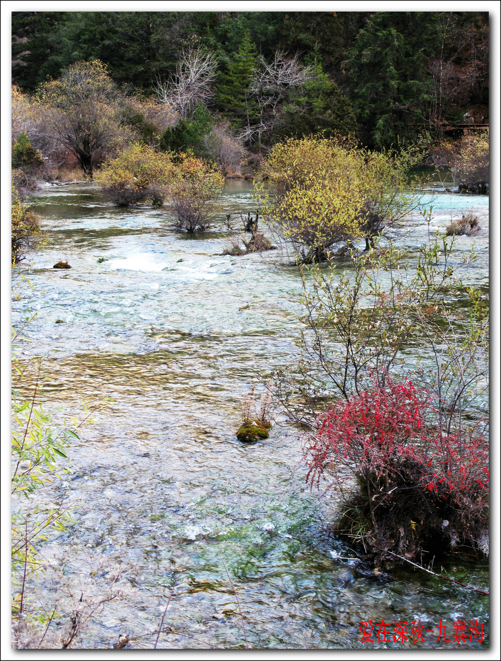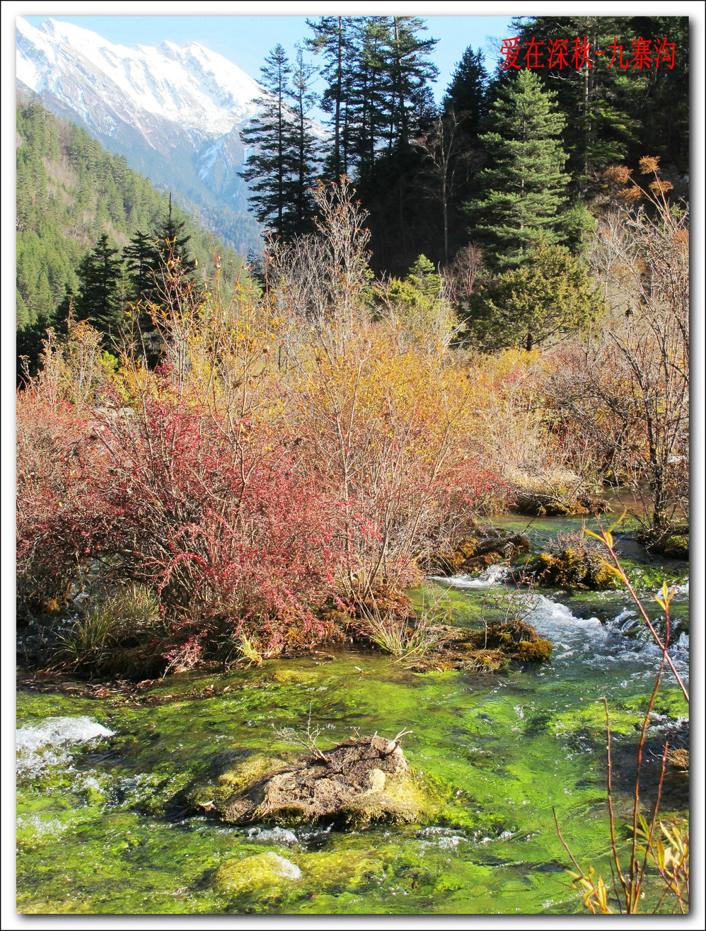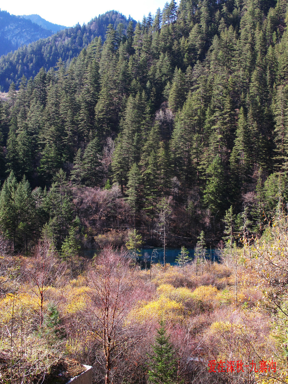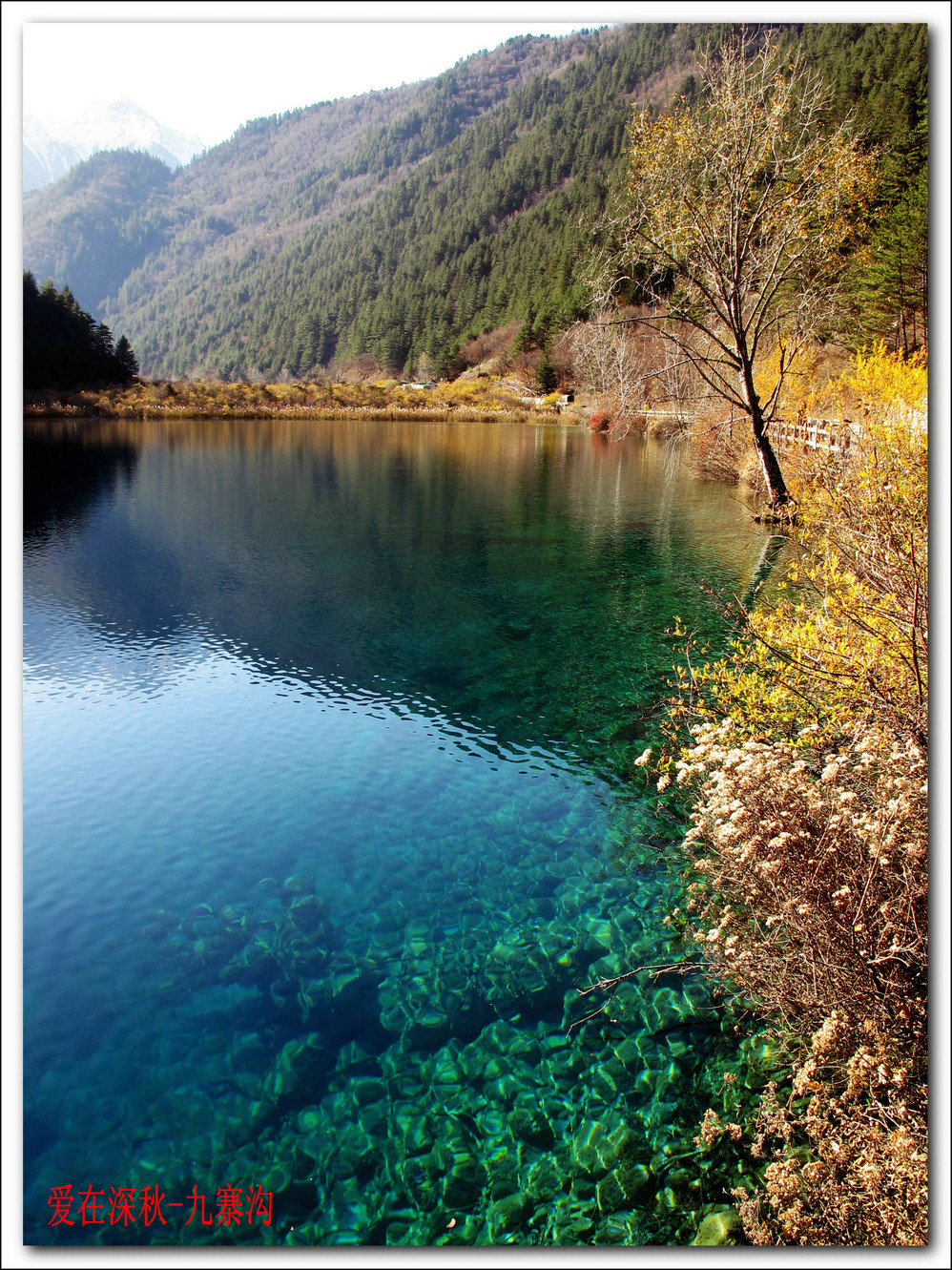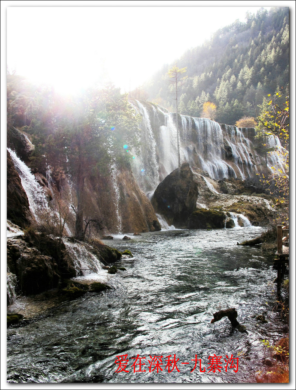 十年前去了一趟九寨沟,坐汽车前往,在路上堵了十个钟,留在脑海中的印象最深的是同事们一路从成都一路唱着到九寨,又从九寨唱上黄龙,导游在边上说什么高原反应都没感觉。好开心,但现在都翻不出几张当时的照片了,上周在成都,就顺便参加了一个三天团,双飞,非常成熟的旅游线路,到达的第二天行程超满,七个小时候在九寨沟景区内活动,晚上到藏家体验了个把小时藏族生活,跟着又观看了上一场命为“藏迷”的情景晚会,难得的是当天进去的人数只的几千人, 沿途景点都有旅游车接送,在深秋九寨沟秋高气爽,虽然植被单调些,但秋水、蓝天、黄叶、雪山构成的色调,在秋日下也不失九寨的经典美色。