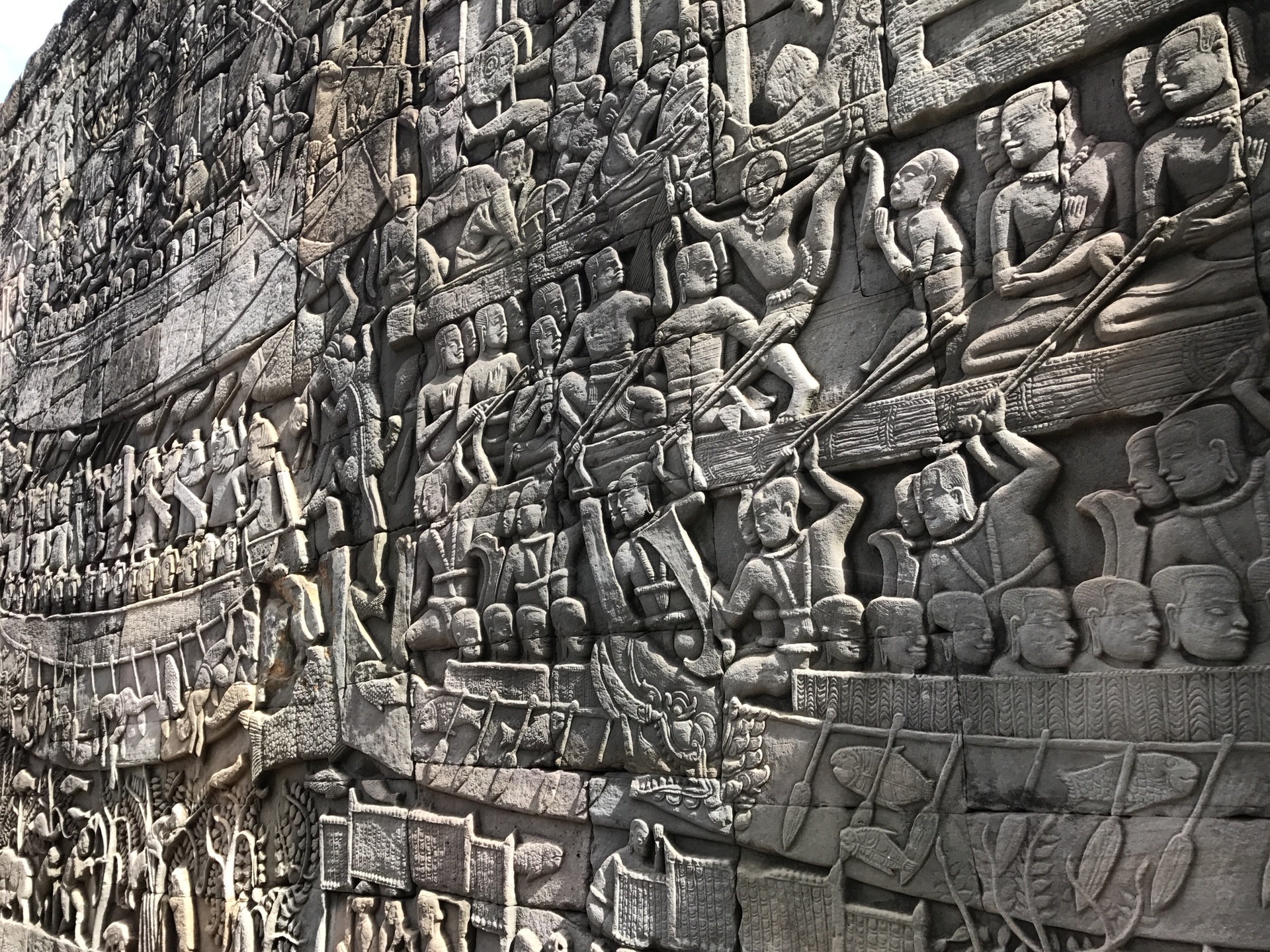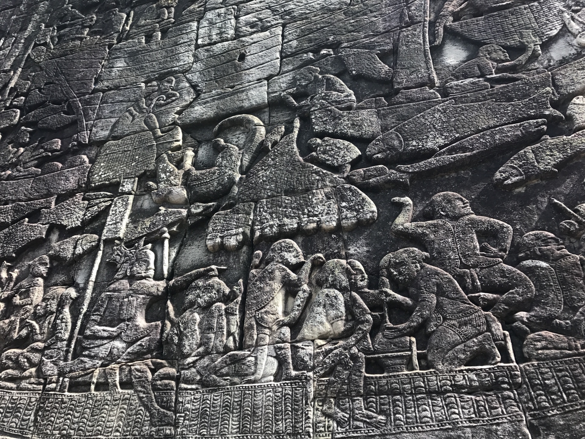 底层浮雕从东门开始顺时针行进,看到的分别是:出征占婆-林迦崇拜-水战--水上生活-赢得胜利-斗鸡和下棋-军队-内战-大鱼吞羊-胜利游行-马戏团-占婆人洗劫吴哥。