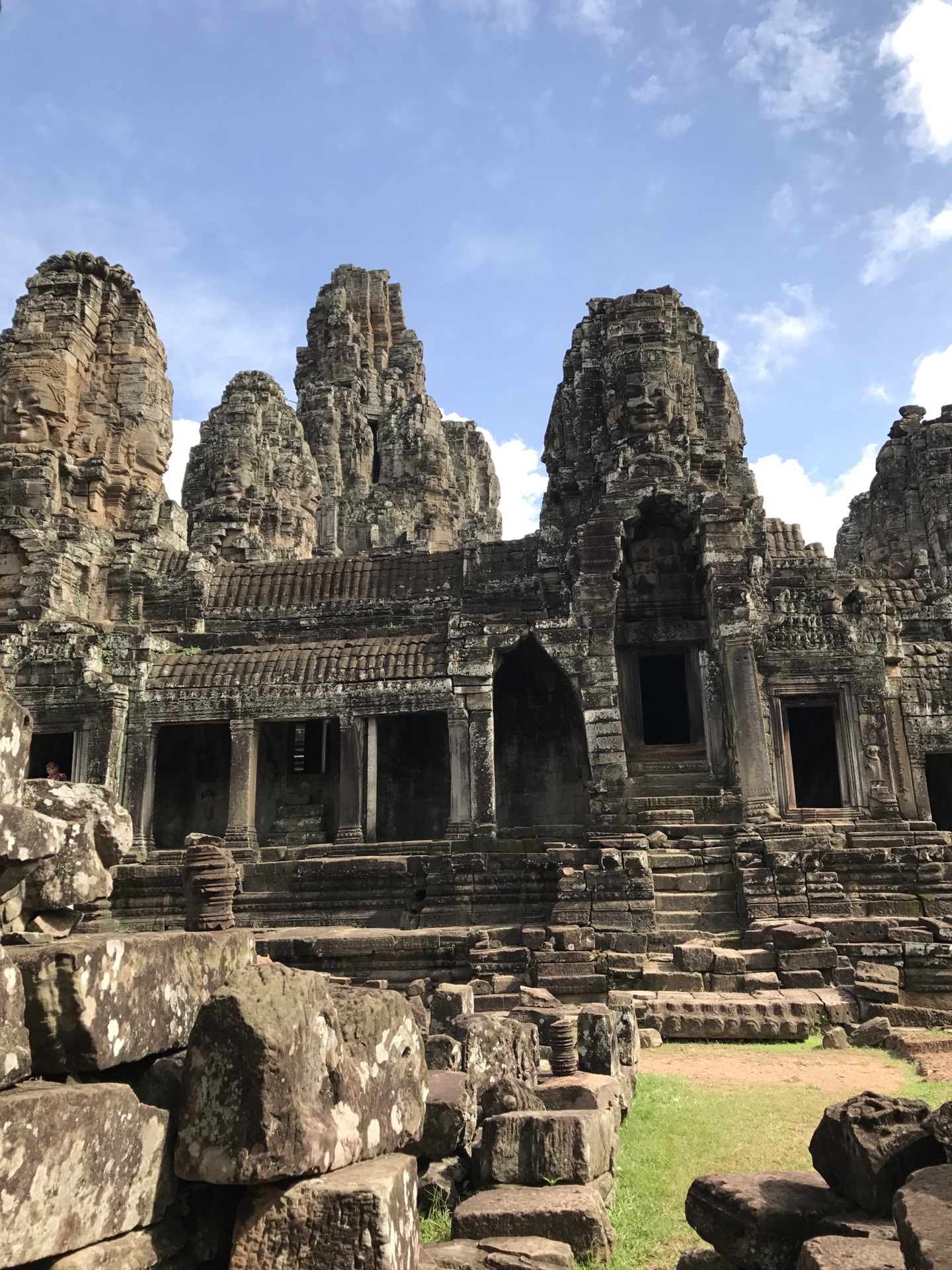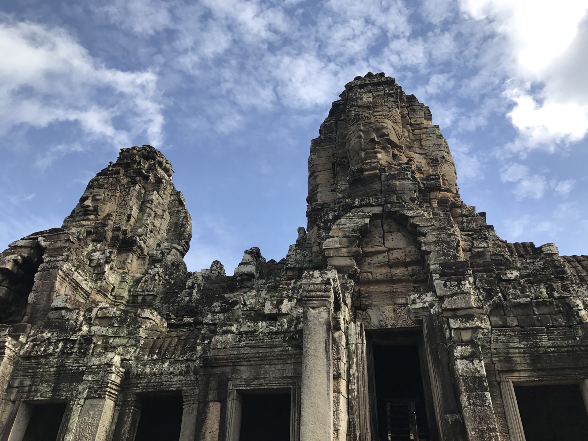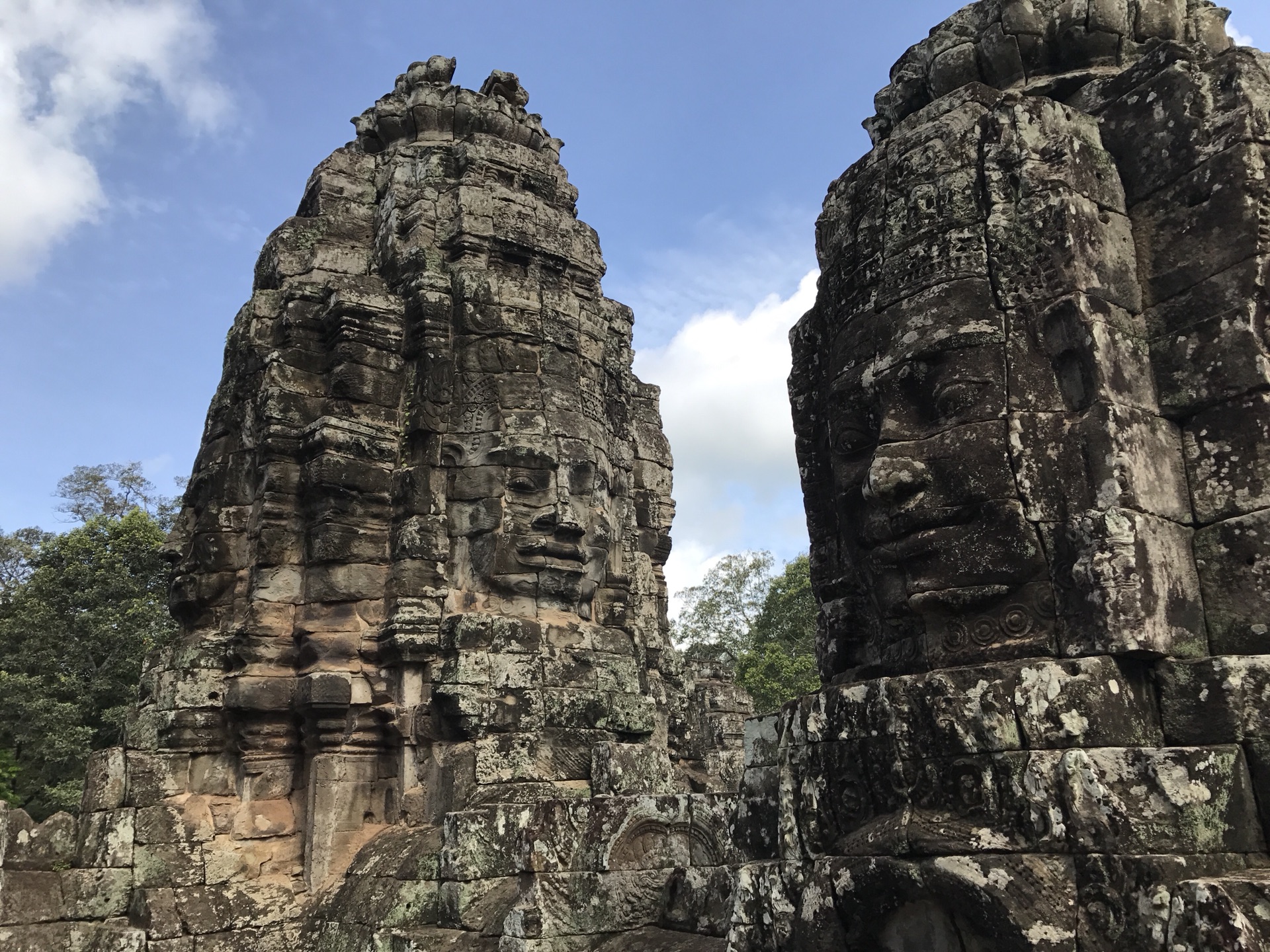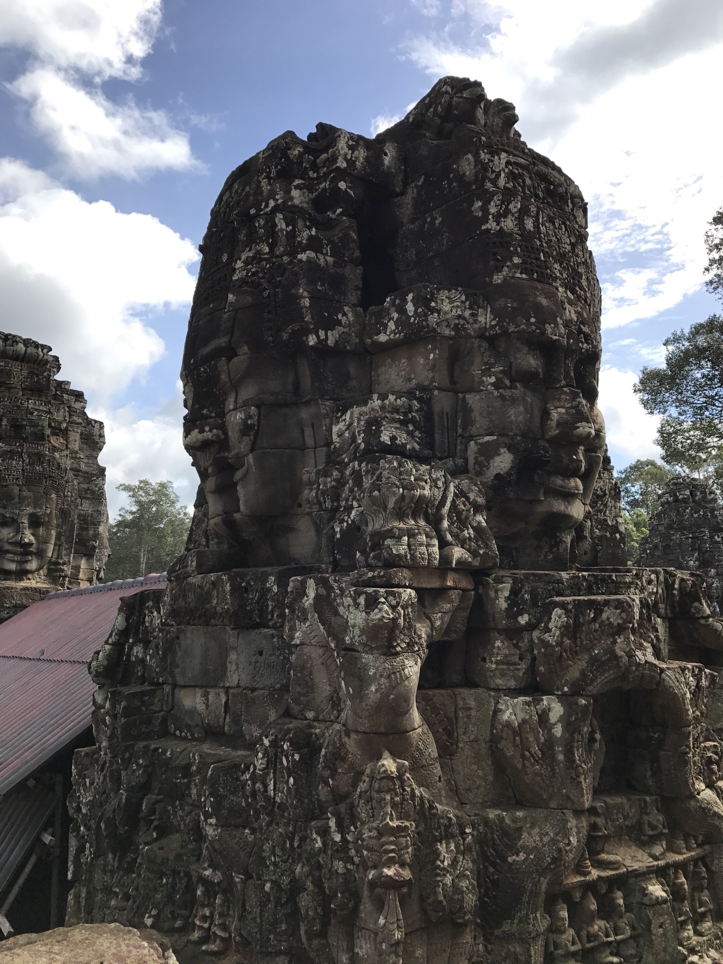 位居中心的四面佛塔群,原有 49 座,加上 5 座亦是四面佛塔式城门,代表当时鼎盛吴哥王朝所统辖的 54 个省份,即使是同一个宝塔,不同方向的脸,也是不一样的,也就是说,54个宝塔,216个笑脸,每一个高棉的微笑,都在向游客展现一个不同的笑容。