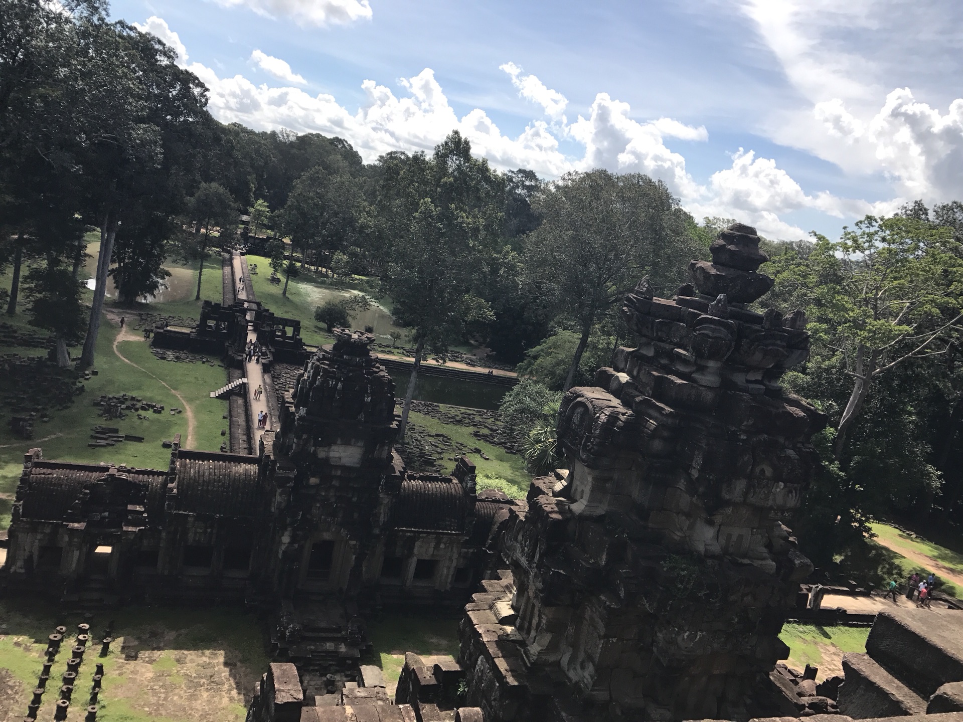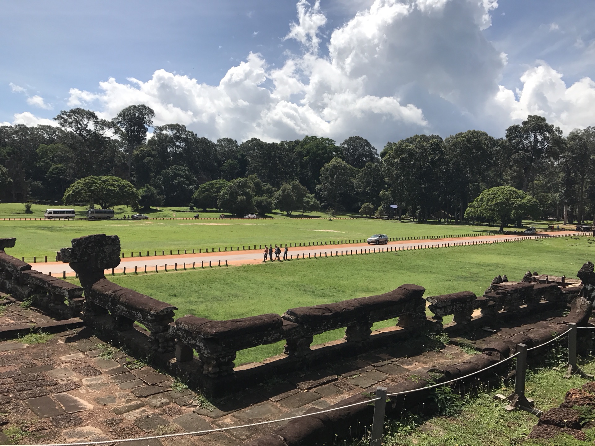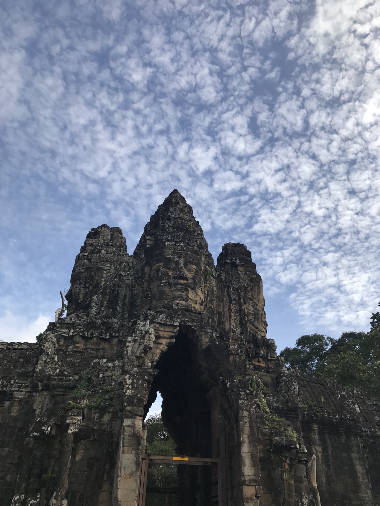 买过门票后,开车到通王城门口,通王城又称大吴哥,是吴哥王朝的首都,多次毁于战火,后几经重修。先今一直是12世纪末、13世纪初由阇耶跋摩七世所建。通王城呈正方形,是一处被长达12公里的城池所包围的城市。在吴哥城中央,依照佛教须弥山的概念建立起了壮观的巴戎寺(Bayon),在整个通王城的范围内,还有巴方寺(Baphoun)、绯明纳卡寺(Phimeanakas)、癞王坛(LeperKing)、战象台阶(Terr ace of Elephants)等著名建筑。坐落在吴哥通王城内部的皇宫年代更为久远,属于十世纪早期国王、十世纪国王及十一世纪早期国王。尽管皇宫的地基和城墙都已经被确认,但是围墙内却几乎没什么建筑遗迹。正是由于这些皇家建筑缺少考古学证明,在很大程度上说明它们由木头建成,如今已经被腐蚀了。法国人为这座皇宫确定了一个版图,其中包括吴哥古皇宫的寺庙山、周围的水池和一些宫邸、政殿,这些建筑很可能在城墙后面。