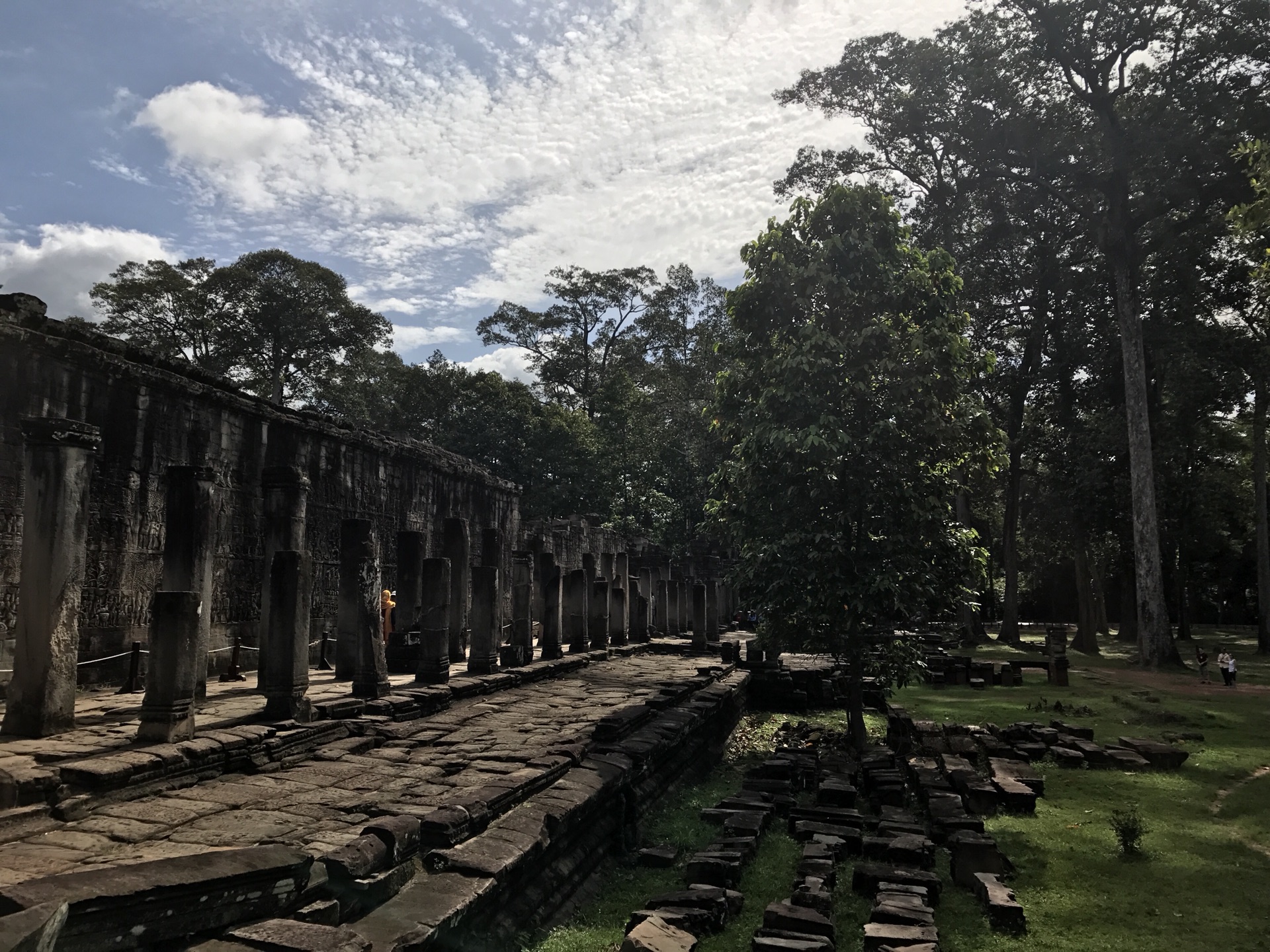巴戎寺的入口。巴戎寺坐落于吴哥通王城之中心点,其回廊东西长160公尺、南北长140公尺;回廊上方原本皆有木造之屋顶,但由于年代久远,目前只剩下断垣残壁及巨大之石柱供后人凭吊。阇耶跋摩七世时期,柬埔寨由印度教改信佛教,其实巴戎寺是一座佛教寺院,它的整体构成是以传说中佛教最高境界的须弥山为样本的。