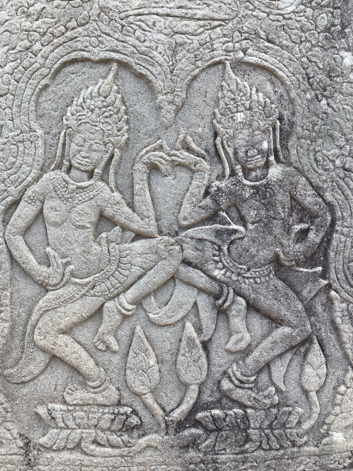 在石柱上跳舞的阿普莎拉女神,传说在修罗和阿修罗搅拌乳海时,从海中升起了阿普莎拉,她们光彩照人,婀娜多姿,发型各异,脸上带着浅浅的微笑。她们的手势是大拇指和食指结合,代表佛印两教合一,另三指朝外,代表水、土、天三界。