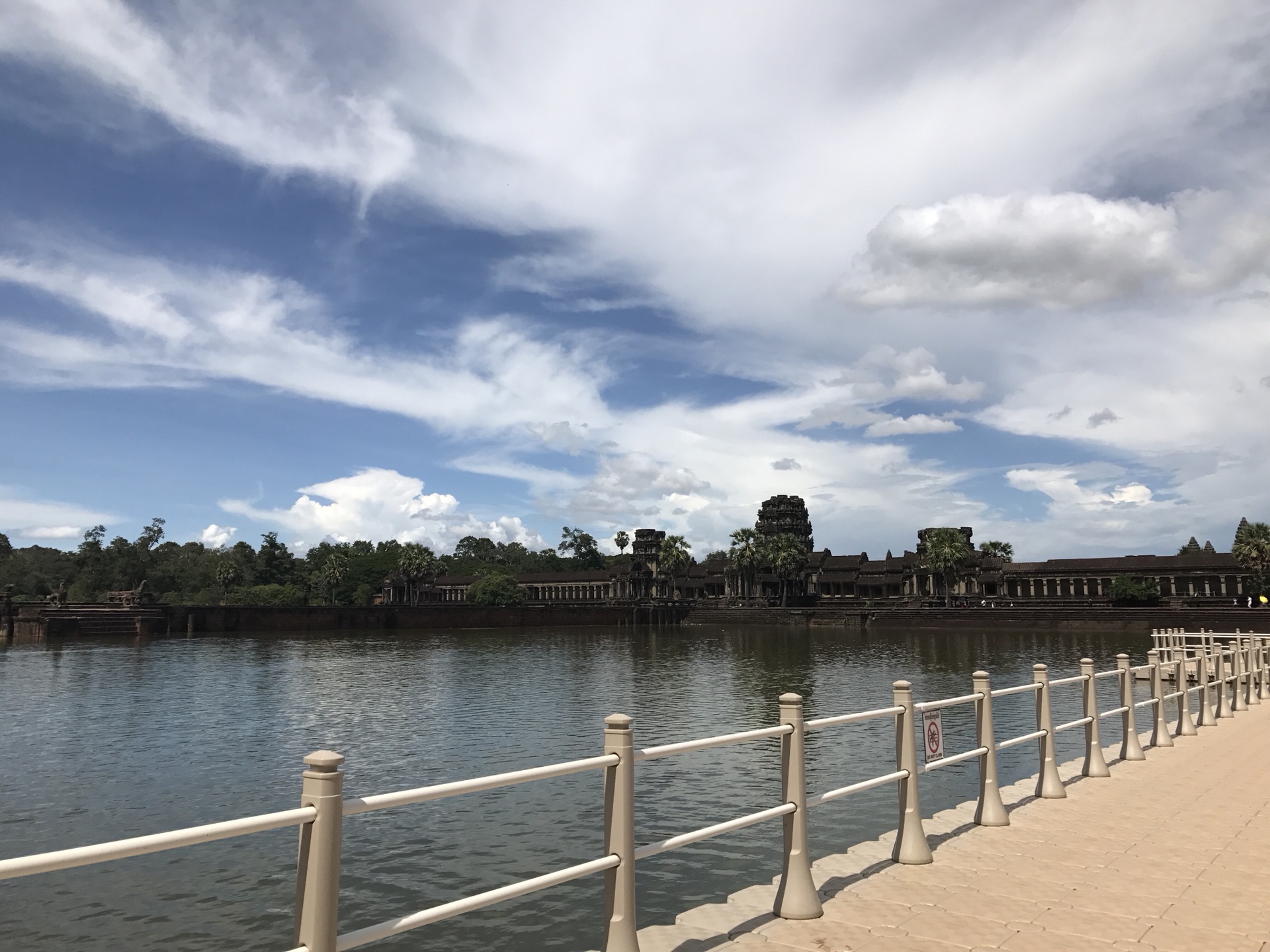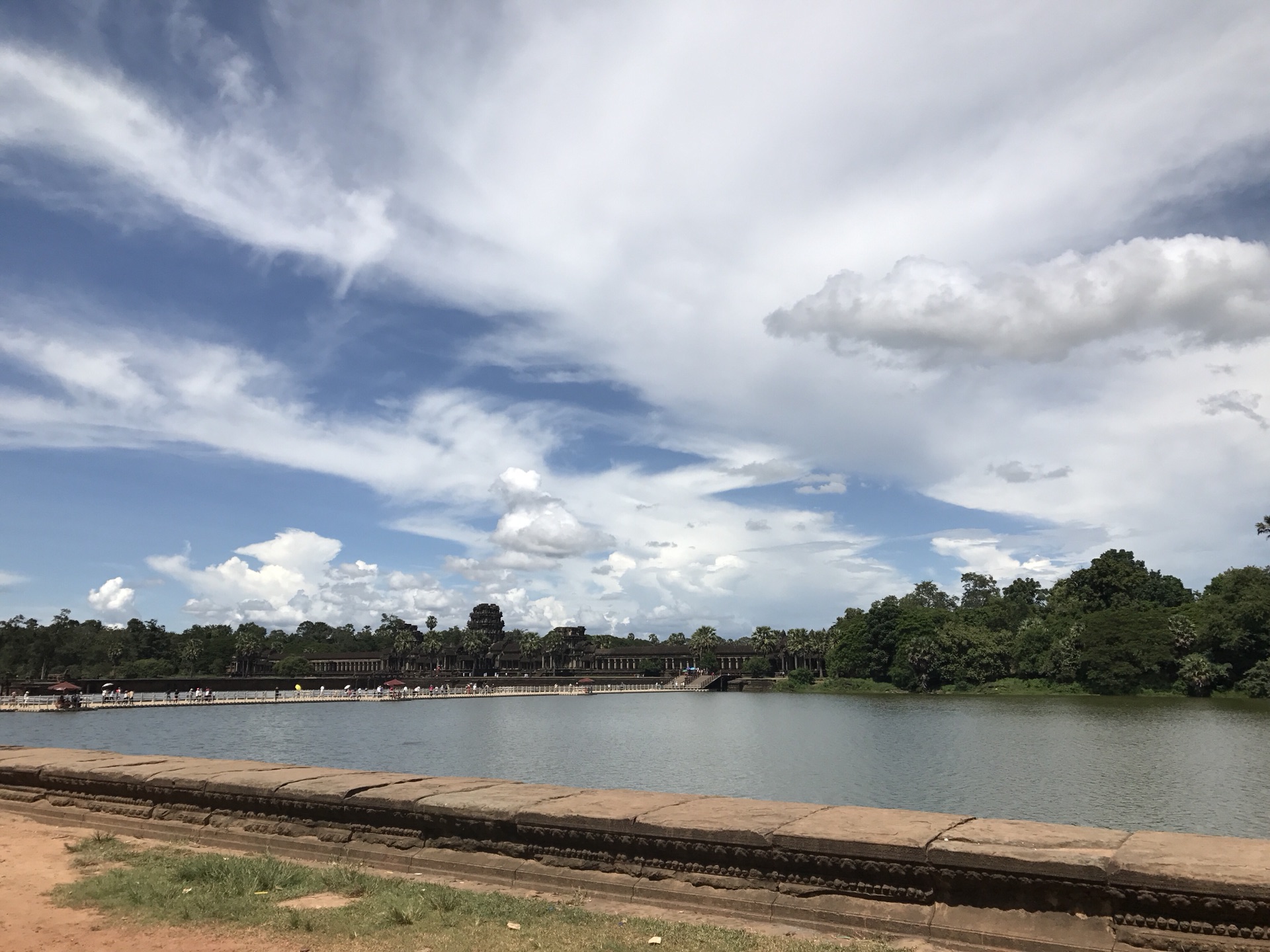 休息完后,下午两点多准时出发,去到最有名的小吴哥,也就是全球有名的吴哥窟,刚刚到的时候,我内心是震撼的。吴哥窟的护城河呈长方形如口字,东西方向长1500米,南北方向长1350米,全长5700米;河面宽190米。护城河外岸有砂岩矮围栏围绕。那条宽广的护城河,提醒着我们这个城市和国度曾经的伟大和辉煌。