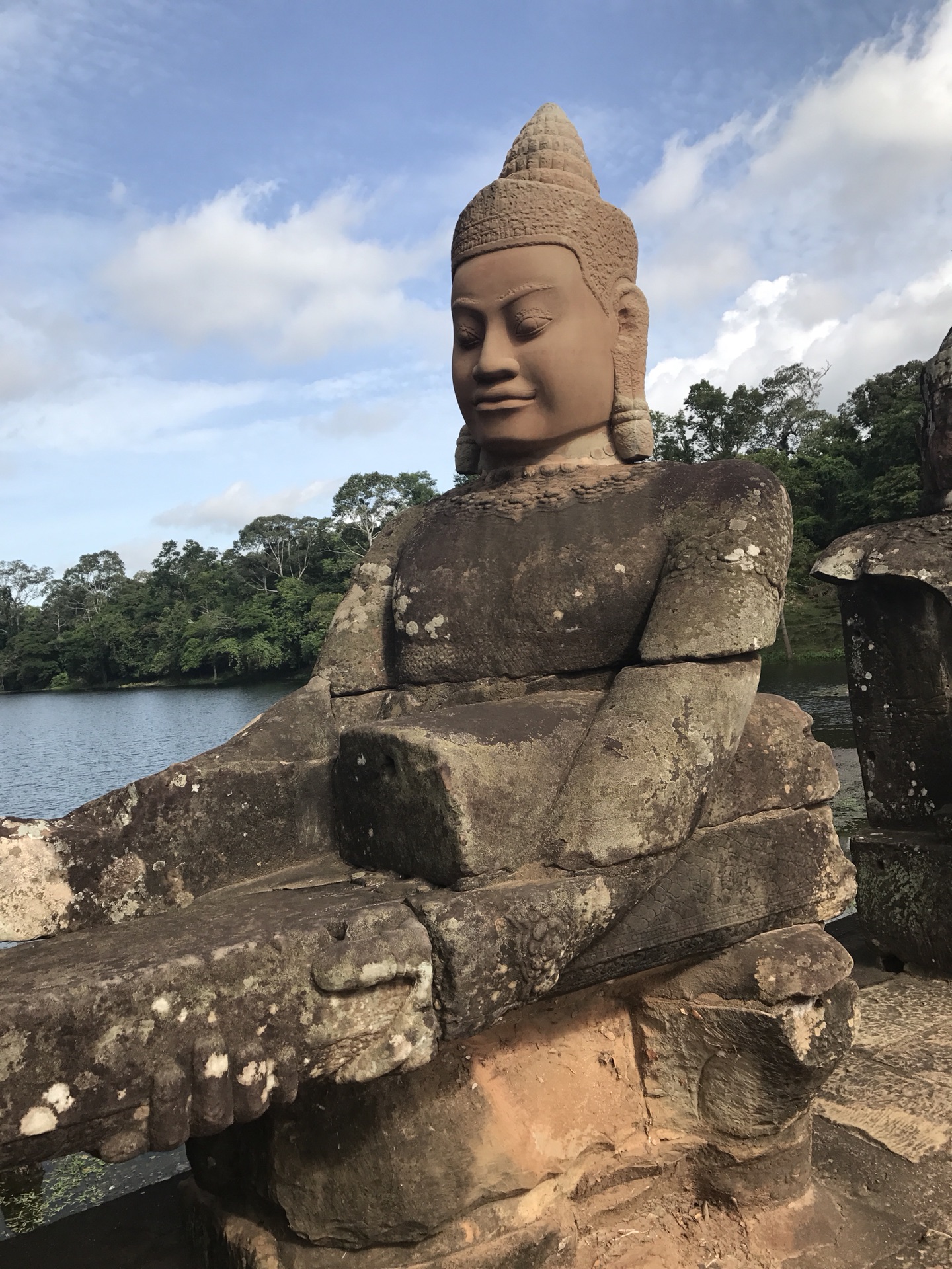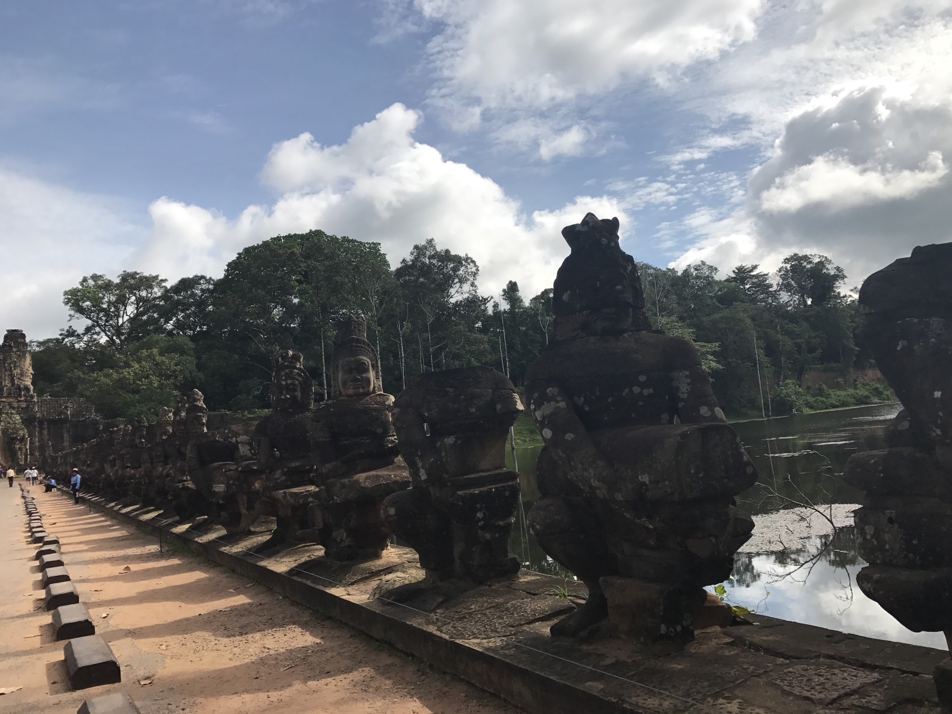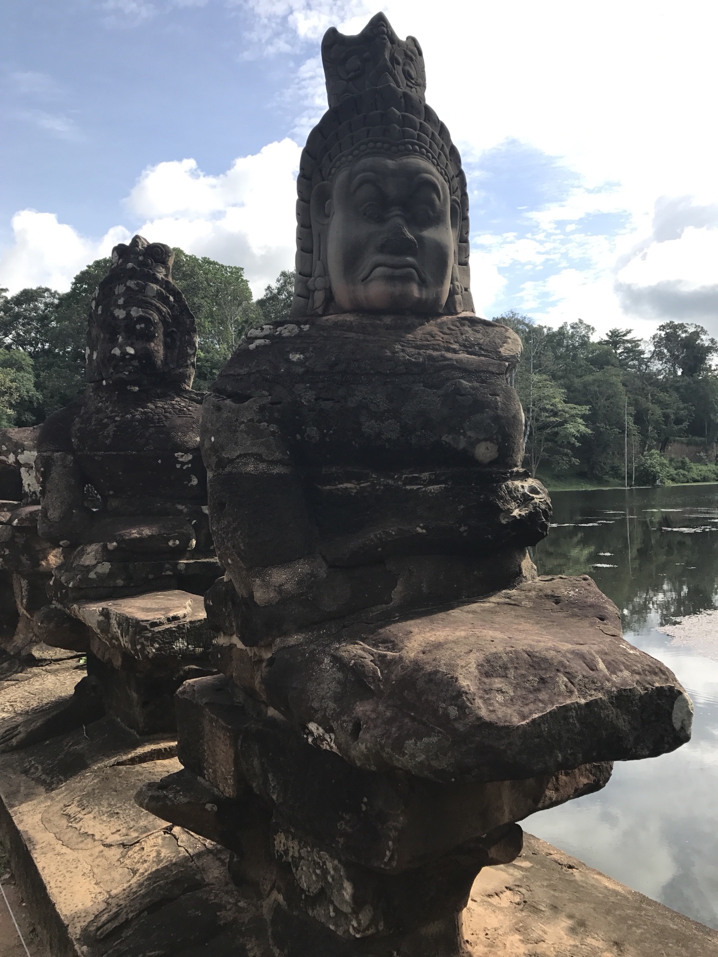 大吴哥的入口,右侧是阿修罗(魔鬼),左侧是修罗(天神),断掉的是印度教的大神娜迦,娜迦(Naga)是有7个头的大蛇,印度教里的水神,众神拔河时的绳子(搅拌乳海时),强大凶悍(就是打不过迦鲁达),他的样子在吴哥中几乎无处不见(不是在迦鲁达脚下踩着,就是嘴里叼着,要不就被众神拽着),是整个吴哥出现最多的神。桥两侧的石雕为修罗与阿修罗合力搅拌乳海获取长生不老药的故事。