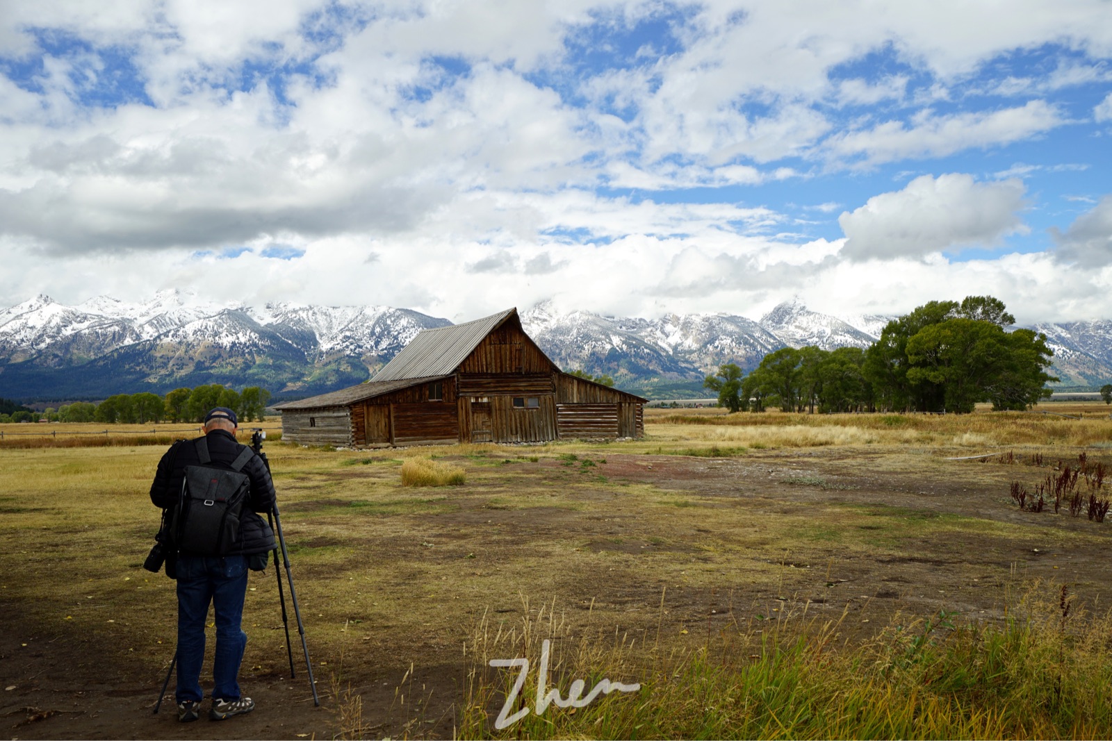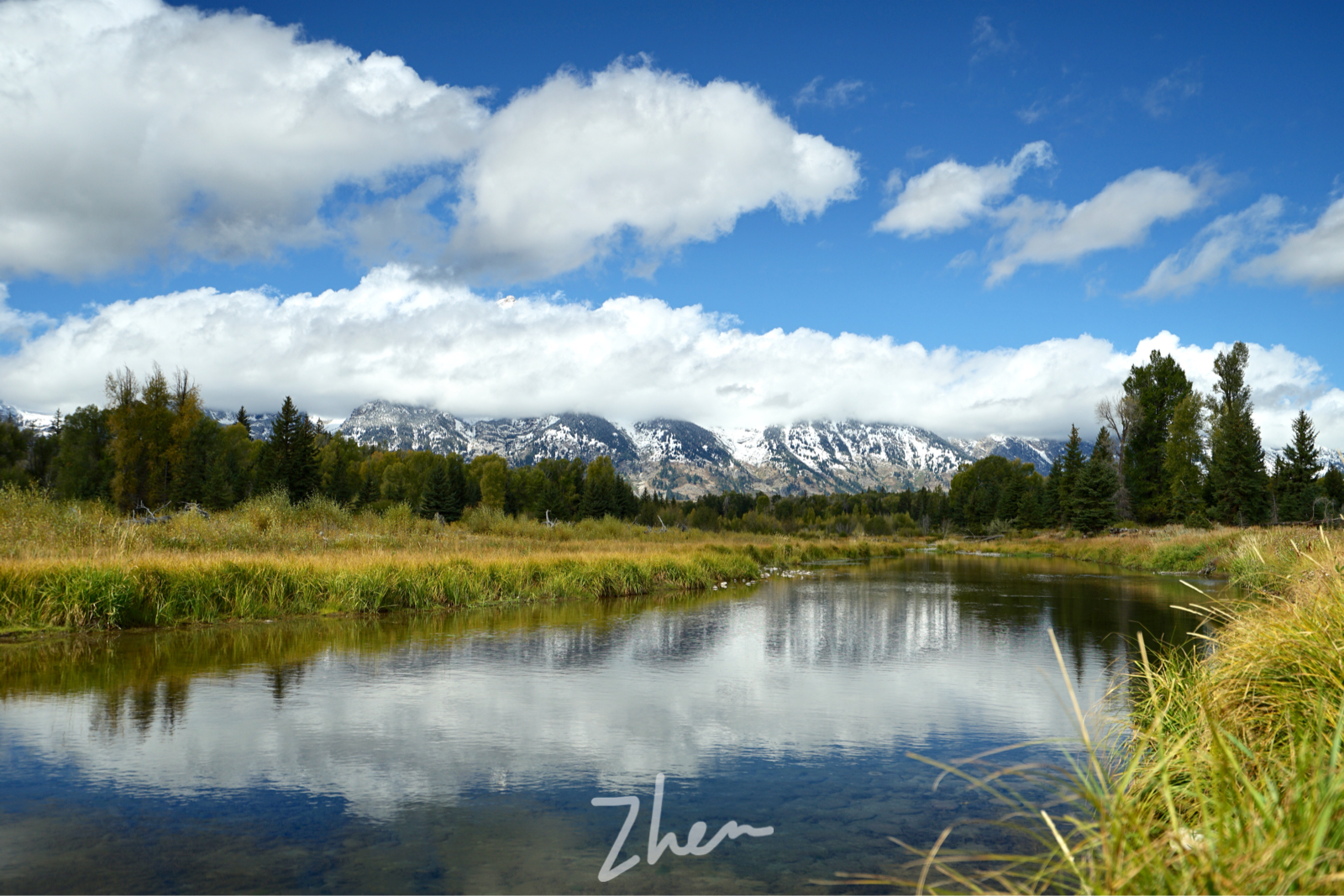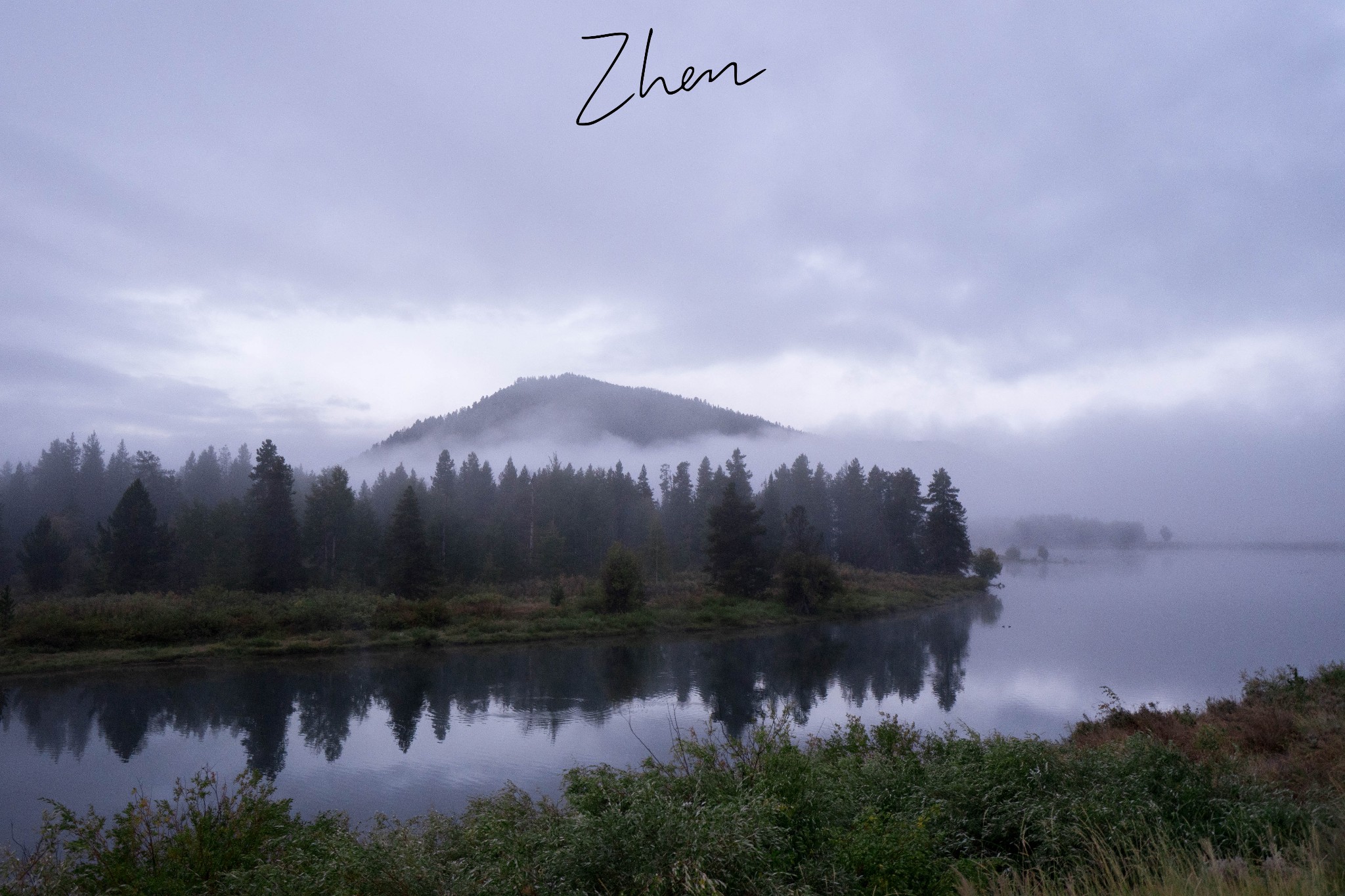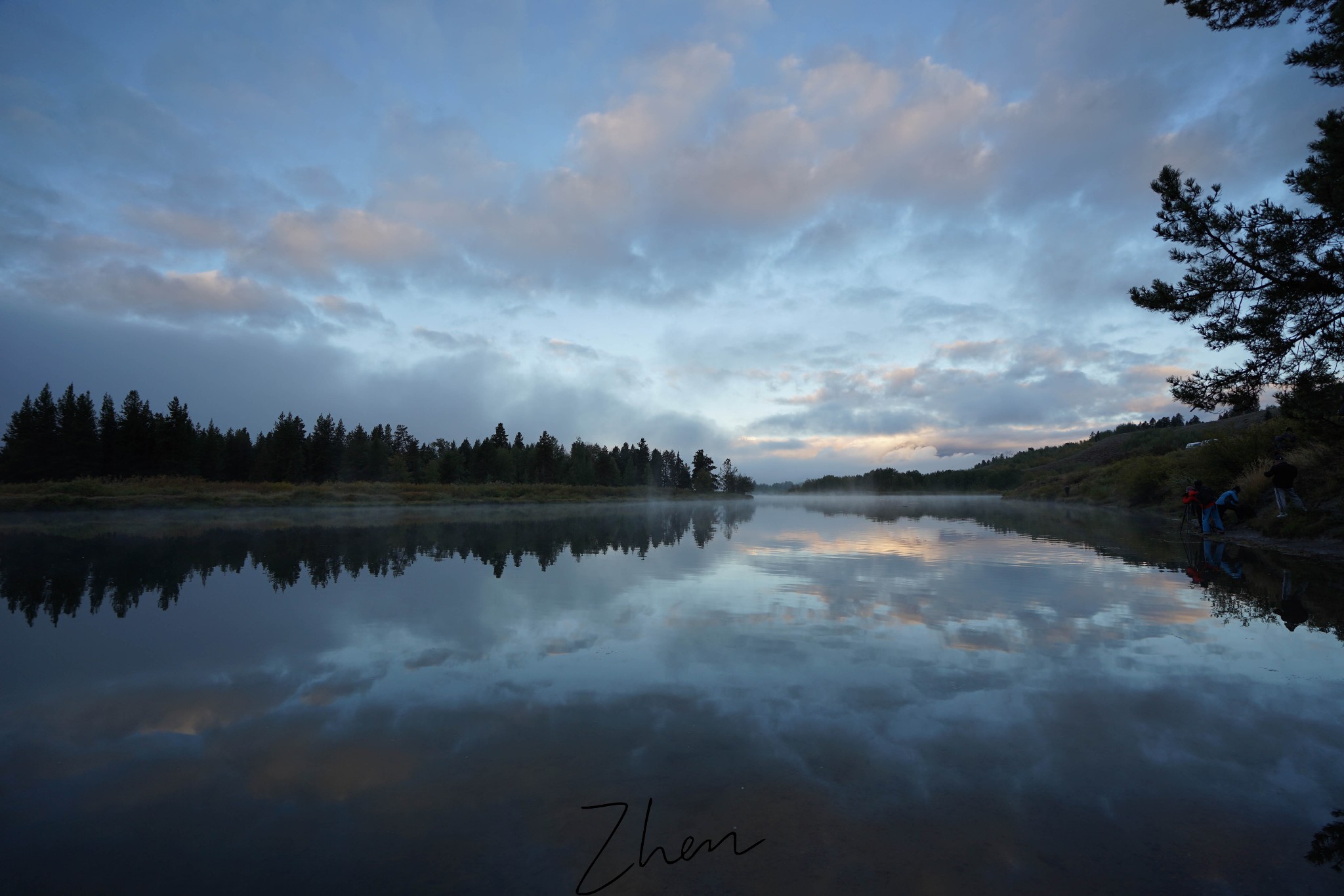 几个适合看日出的点中, Oxbow Bend 离我们最近。一大早就有很多人在水边架着三脚架等待日出,可惜云雾太大,把山峰挡住了,只能看到云彩,山峰一点也没看到