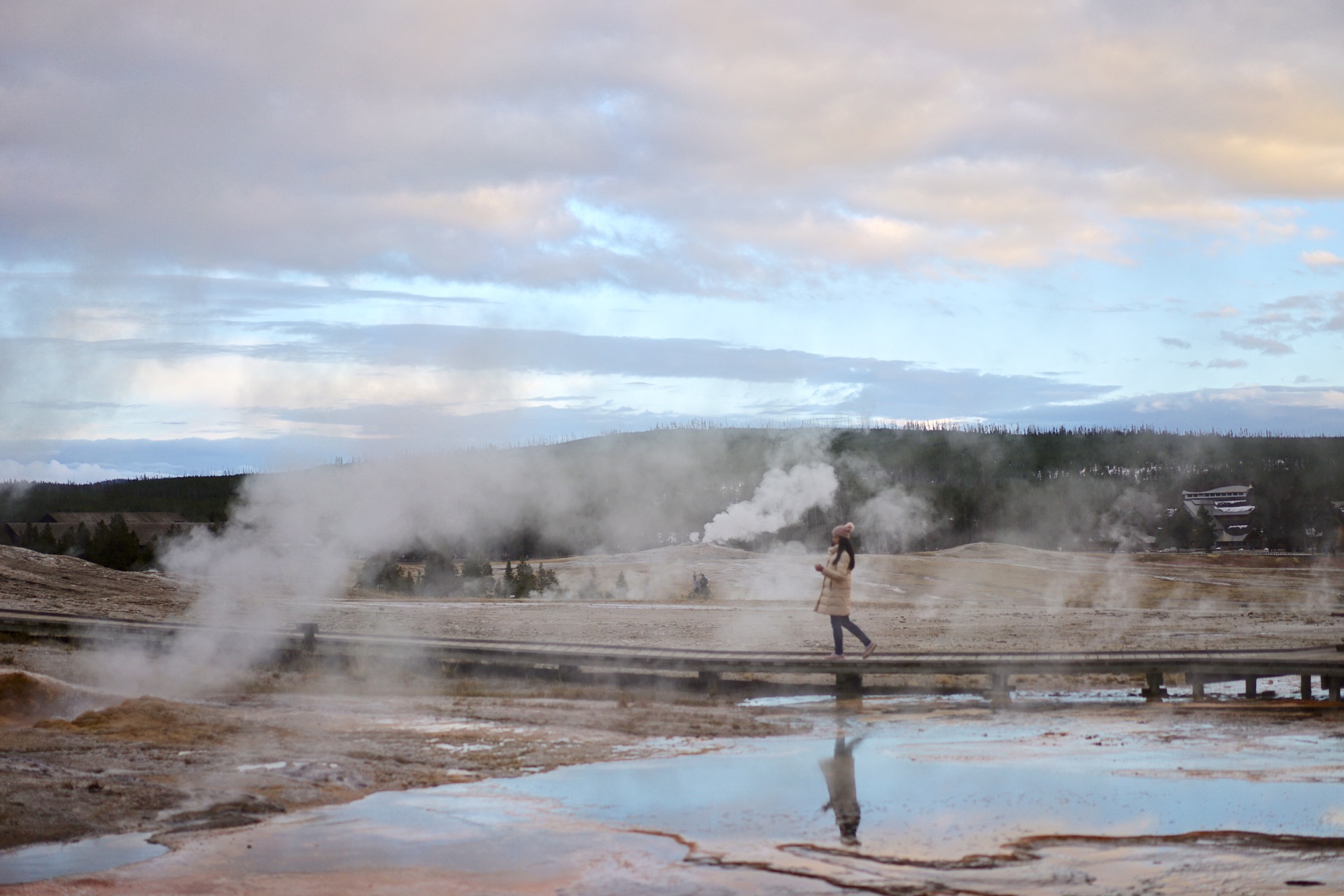 余晖把老忠实泉附近的栈道映得特别美
