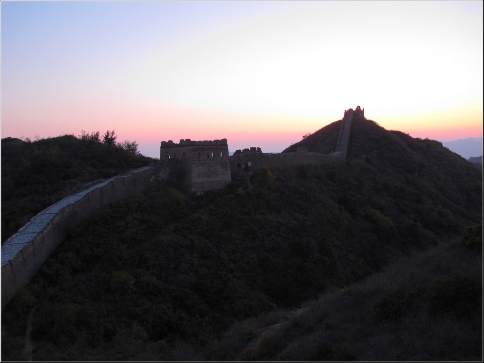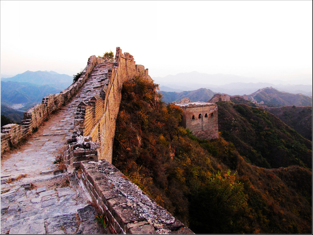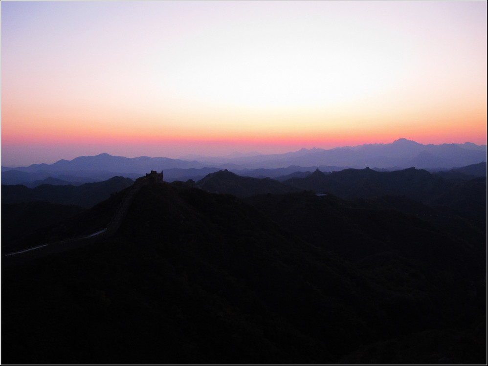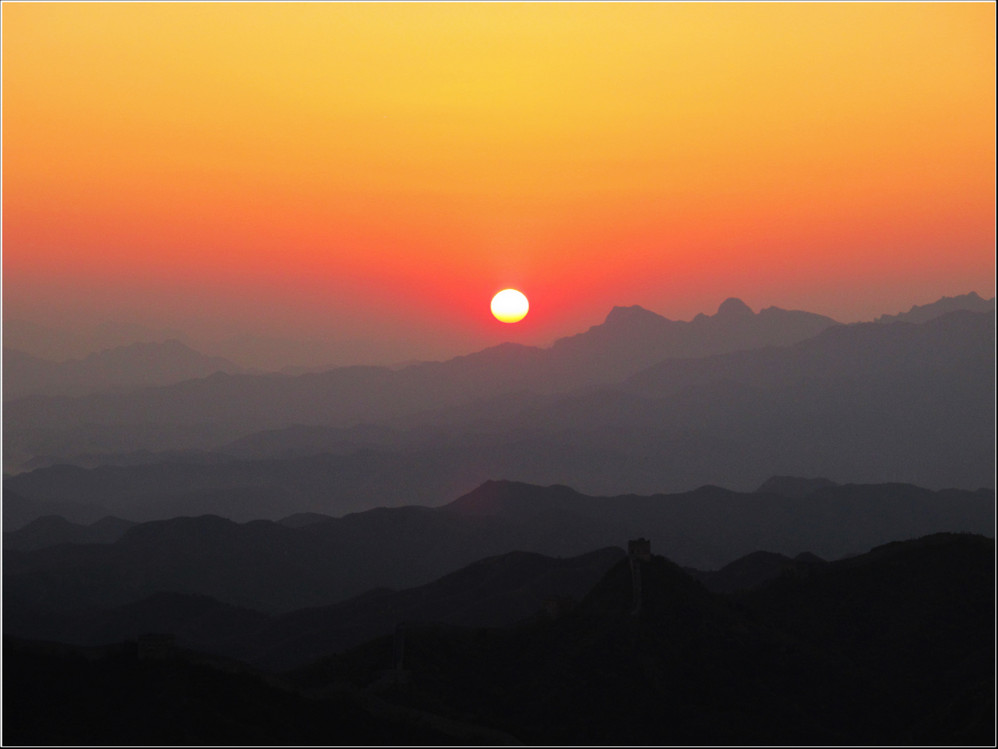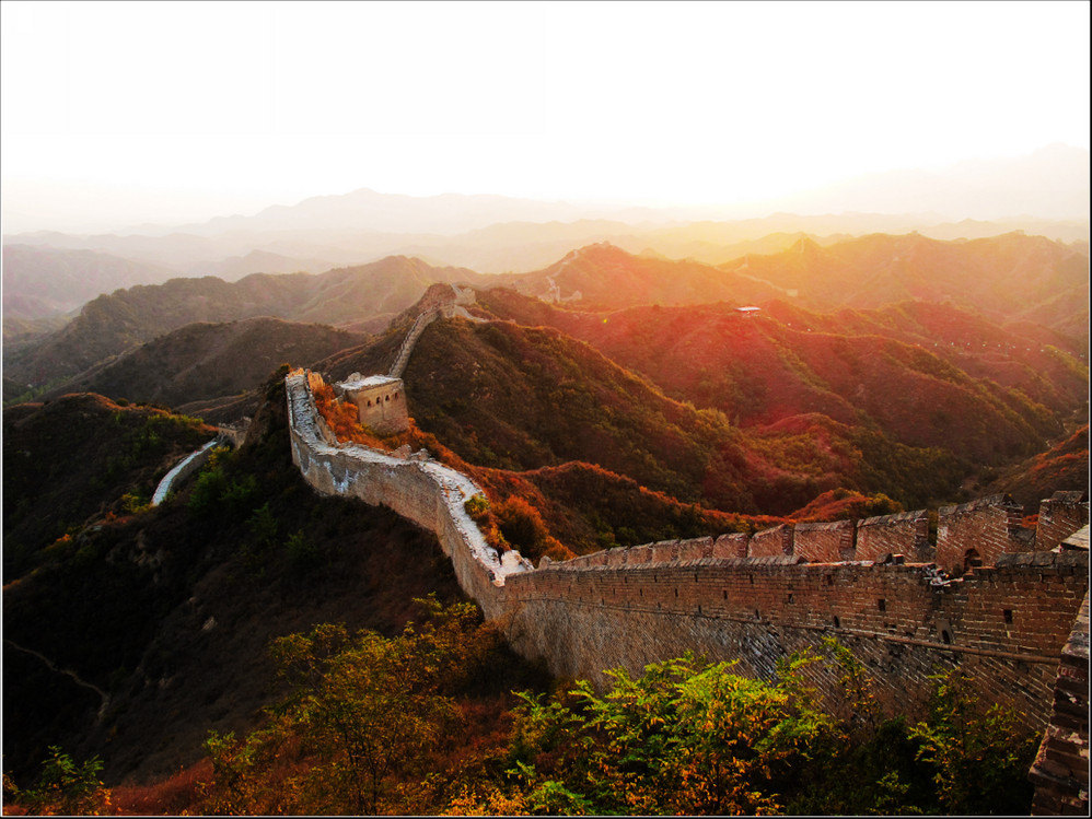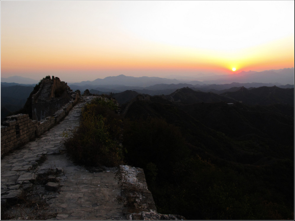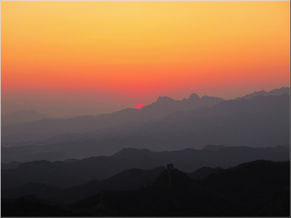 金秋十月的某一天,登上了雄伟壮阔的金山岭长城。极目远眺,万里晴空下,巍巍长城如同一条巨龙横卧在群山峻岭之上,蜿蜒曲折到目不能及。不论从哪个角度看,都能让你倾心感受到古长城的壮美与雄浑,更让你绝对不会吝啬自己的相机快门。当晚霞初现,美丽的夕阳散发出金黄色的光芒,暖暖的铺满长城内外;缓缓的落日由深黄到殷红直到渐渐隐去。享受着金灿灿的夕阳,欣赏着落日余晖下古长城的浓浓秋色,真是美哉!壮哉!