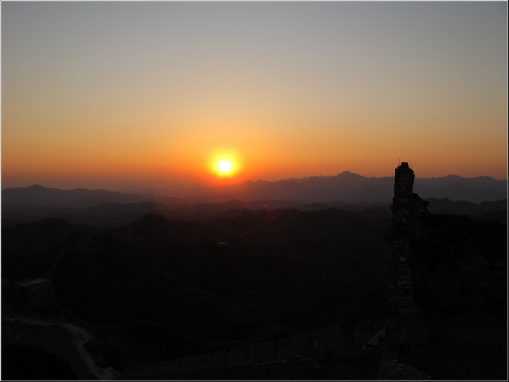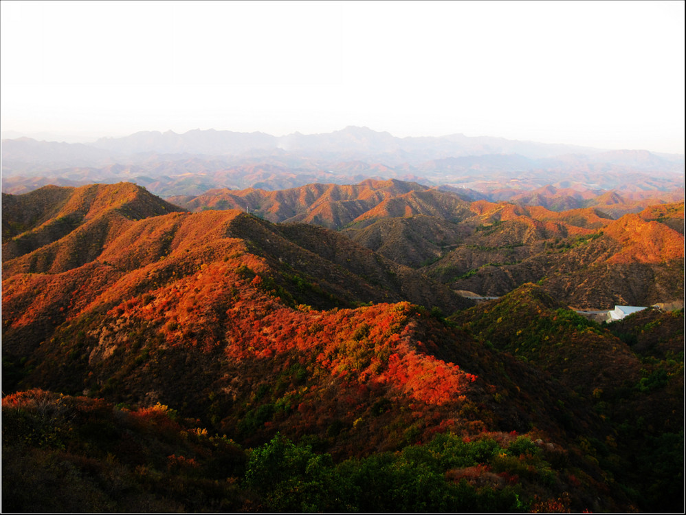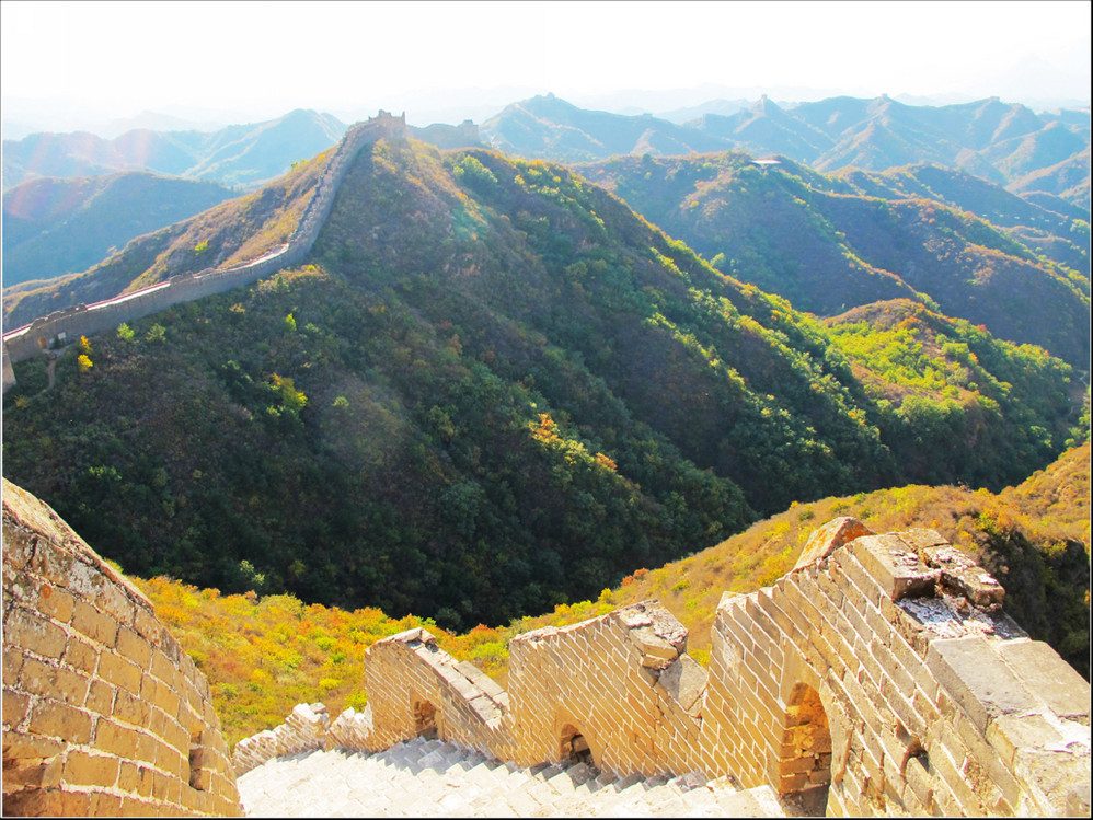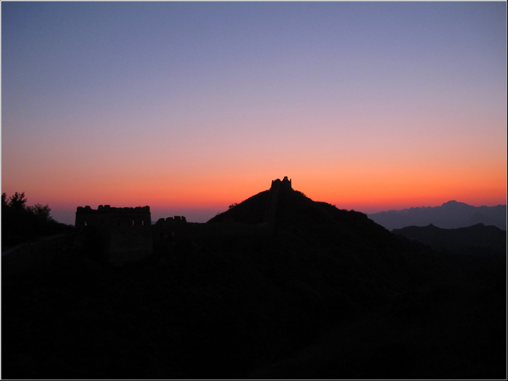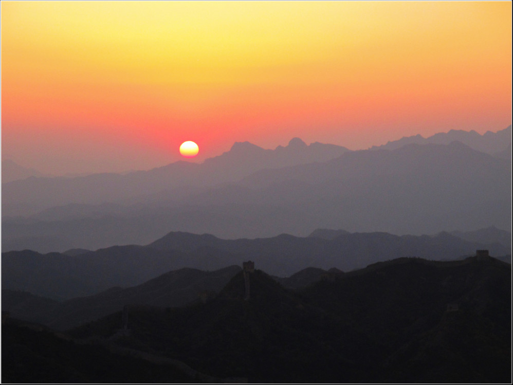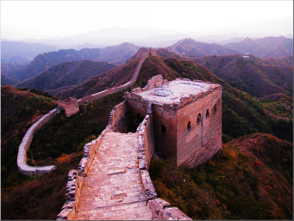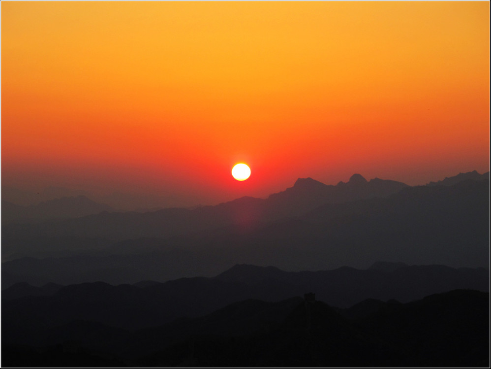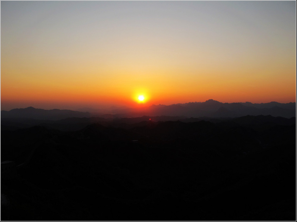 金秋十月的某一天,登上了雄伟壮阔的金山岭长城。极目远眺,万里晴空下,巍巍长城如同一条巨龙横卧在群山峻岭之上,蜿蜒曲折到目不能及。不论从哪个角度看,都能让你倾心感受到古长城的壮美与雄浑,更让你绝对不会吝啬自己的相机快门。当晚霞初现,美丽的夕阳散发出金黄色的光芒,暖暖的铺满长城内外;缓缓的落日由深黄到殷红直到渐渐隐去。享受着金灿灿的夕阳,欣赏着落日余晖下古长城的浓浓秋色,真是美哉!壮哉!