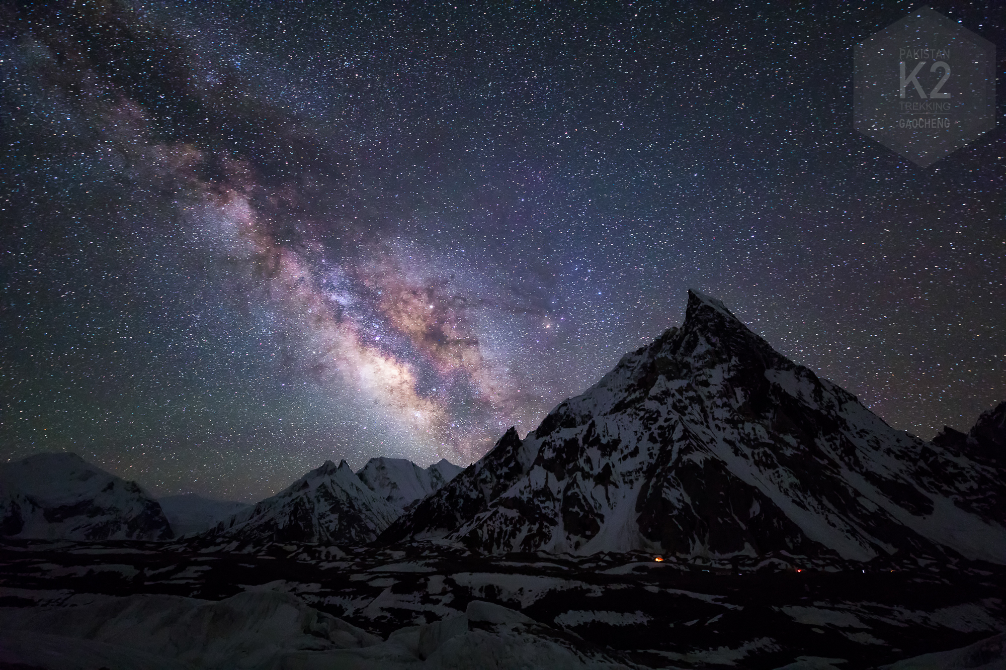 喀喇昆仑腹地的银河全景,图中8611米K2,8051米布洛特峰以及7921米G4清晰可见。