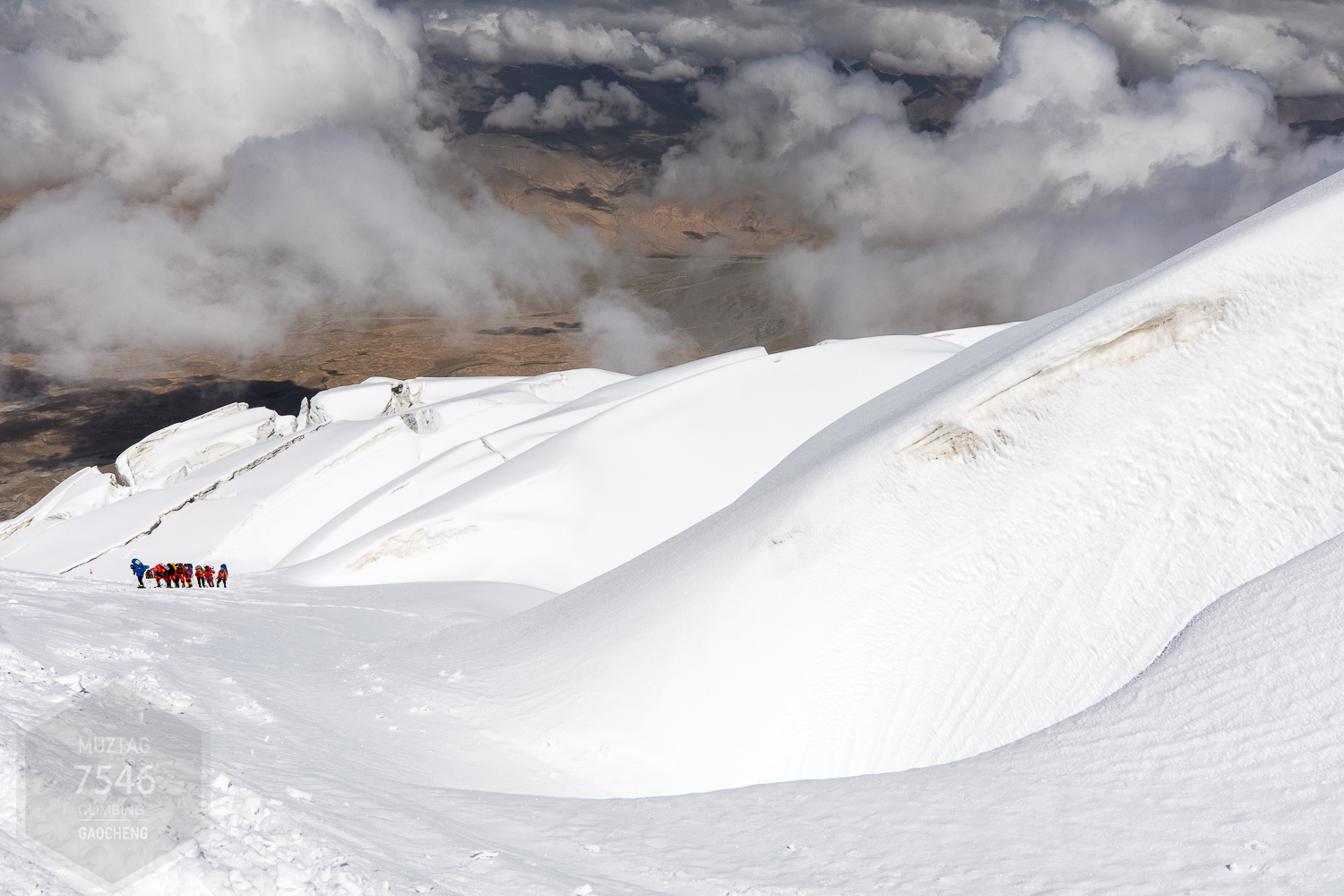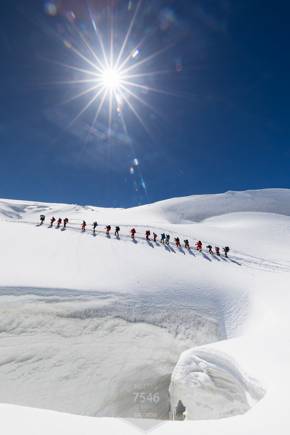 慕士塔格C1-C2营地前进图中,队员结组行走在巨大的冰川之上。