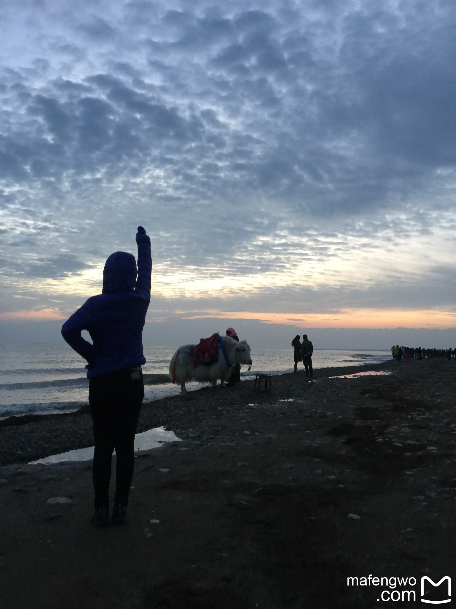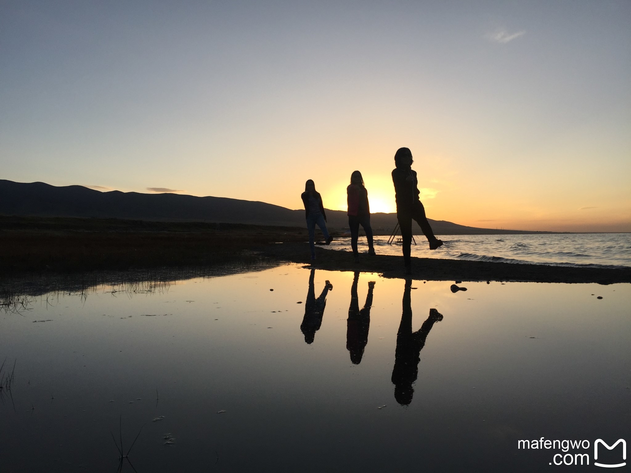 呼吸完毕新鲜空气,继续上路,大概六点十分到了青海湖一个开放的区域(按照我的理解,青海湖周围有很多这样开放的区域,由当地人把守收费,按人收费照相,30~50元每人不等),这边由于地理位置,天黑的晚,据说与北京有大概两个小时的时差,虽然手表时间不用调,但天亮天黑时间不同。所以六点半左右,幸运的遇上了青海湖落日,再加上有小马哥这个白羊座A型血的摄影师,瞬间让我爱上了这夕阳下的青海湖。