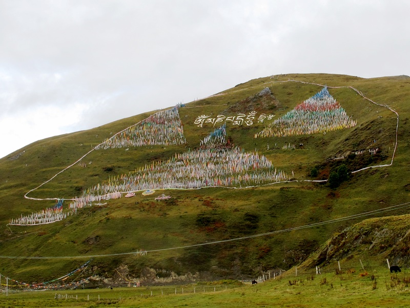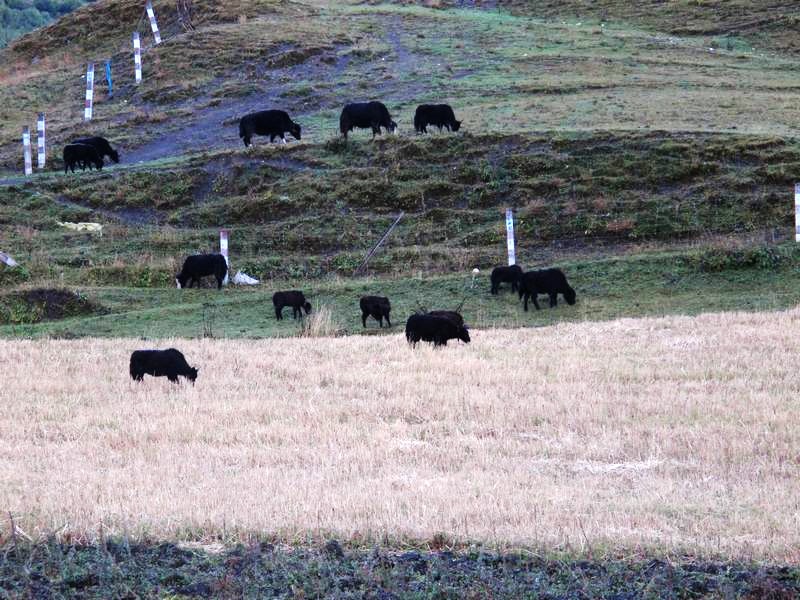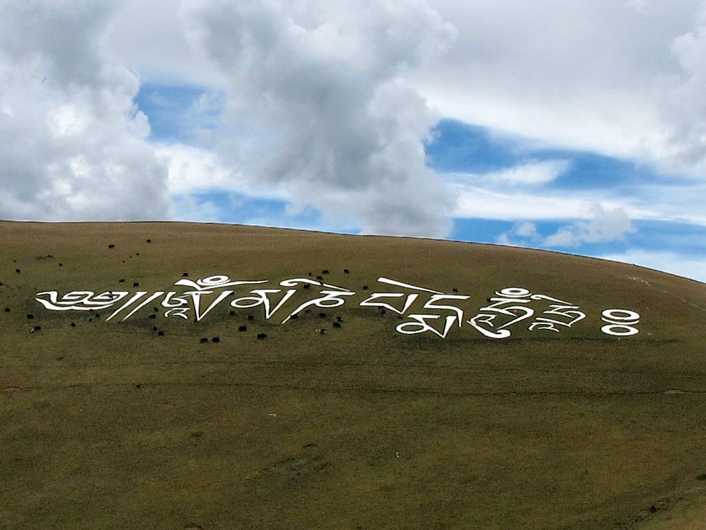 藏区的山上,很多都有这样巨大的白字,是为人们祈福的,那白字边上的一个个小黑点,知道是什么吗,不要说是羊粪球哦,那是牦牛,没想到吧。