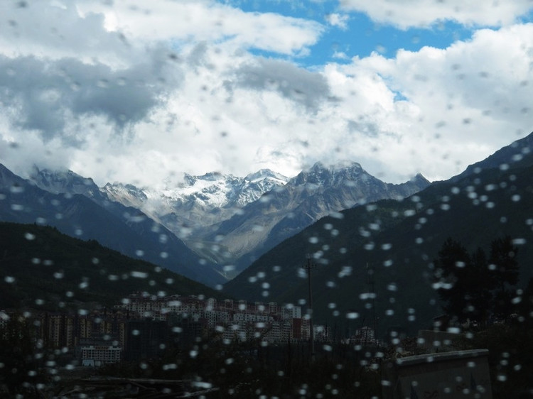 透过镜头,玻璃上的雨点好似雪花,远处的雪山愈加迷人。