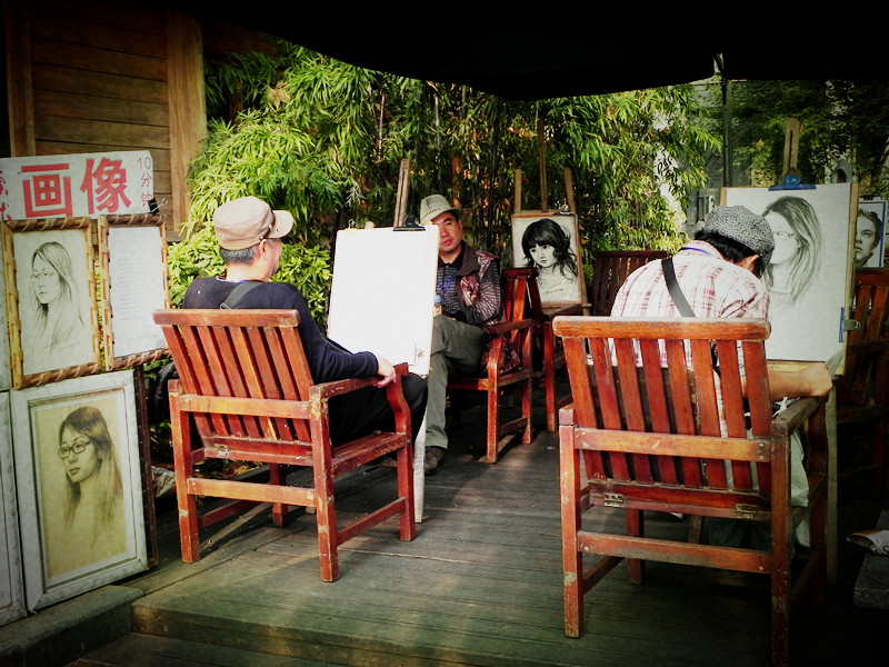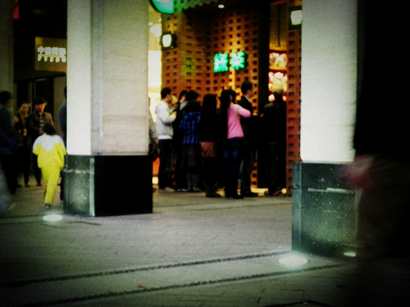 从外婆家走出,路过绿茶,门口站前排队的人们……