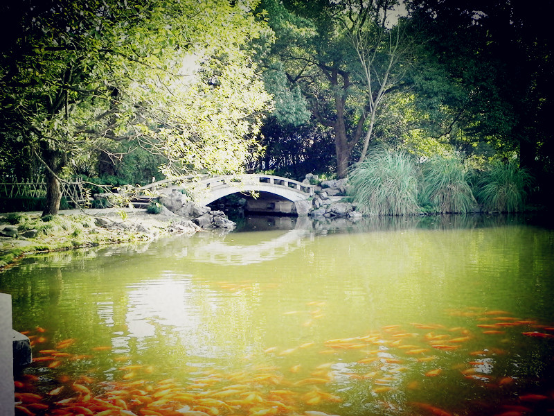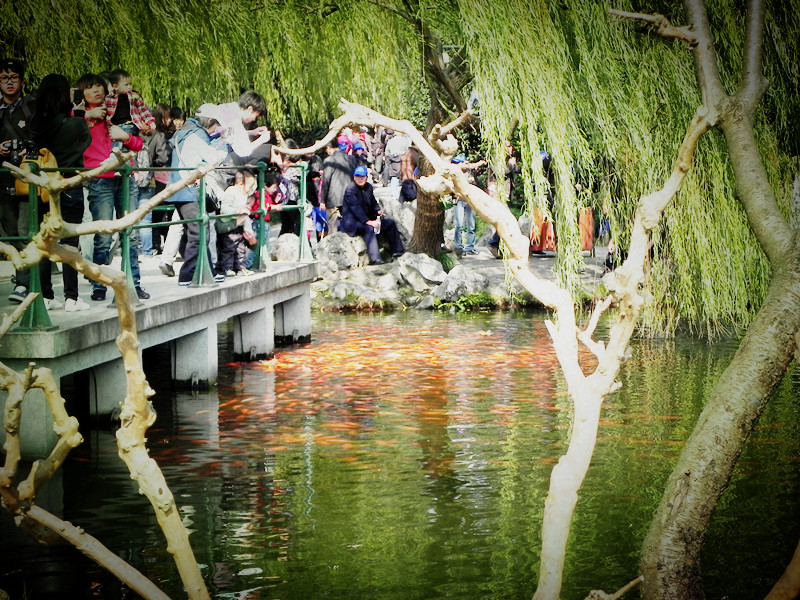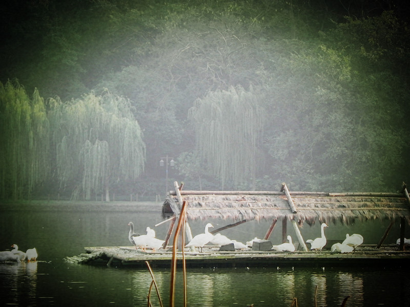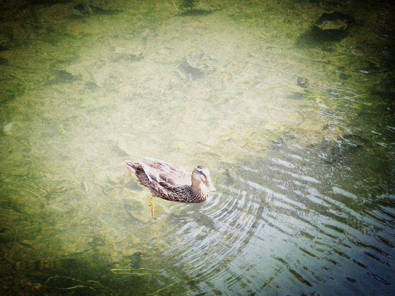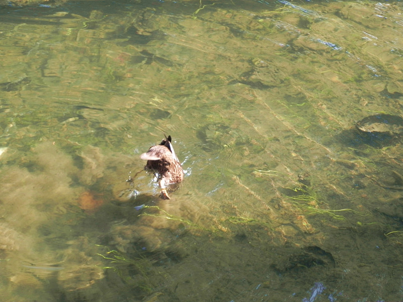 花港观鱼门口一只幸福的鸭子,身边的水里 全是小鱼。